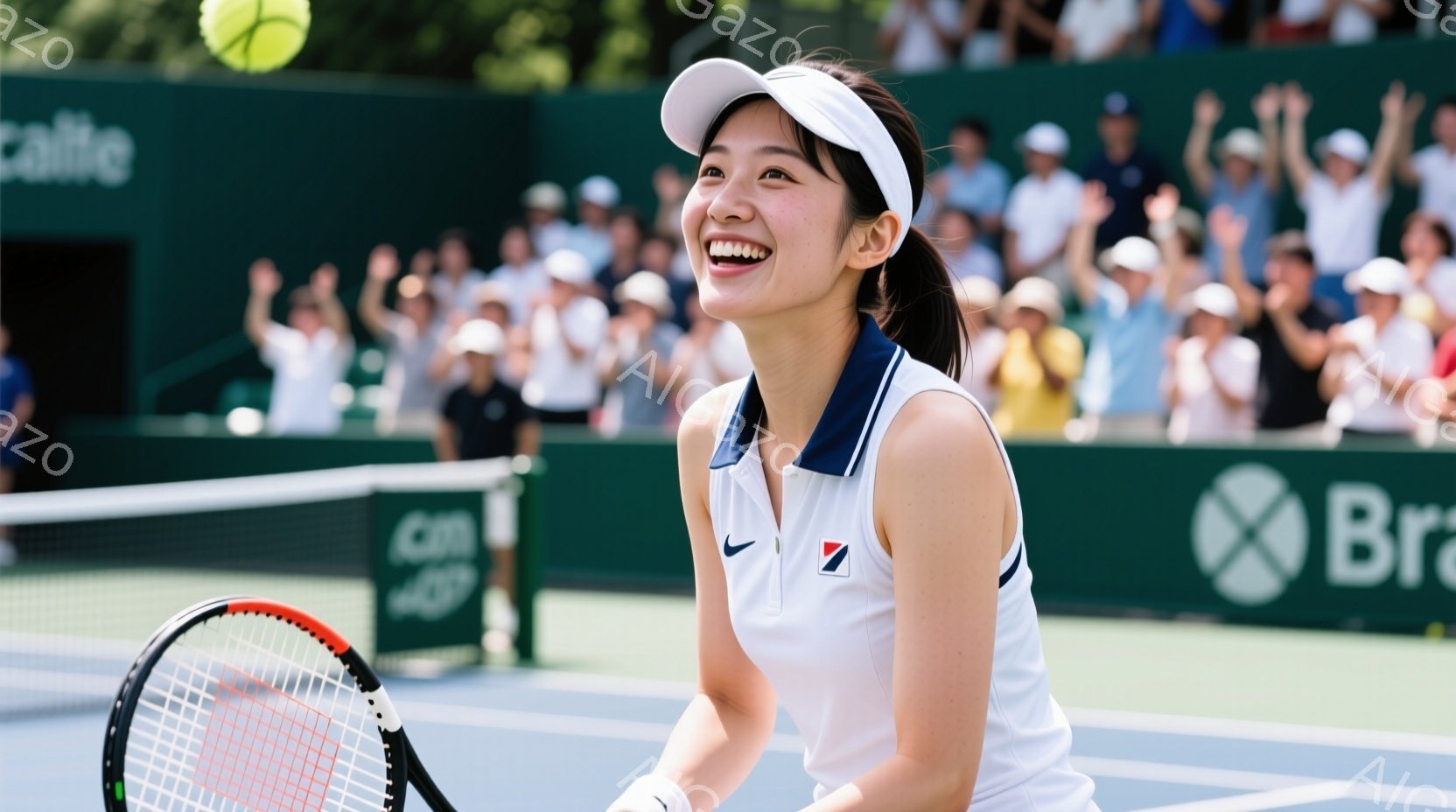 テニス選手である女性が、試合後、ネット際に笑顔で立っている様子が写っている。白いテニスウェアにキャップを被り、髪はポニーテールに結んでいる。背景には観客席が見え、緑の芝生と晴天の空が広がり、勝利の喜びを分かち合う活気ある雰囲気が漂っている。