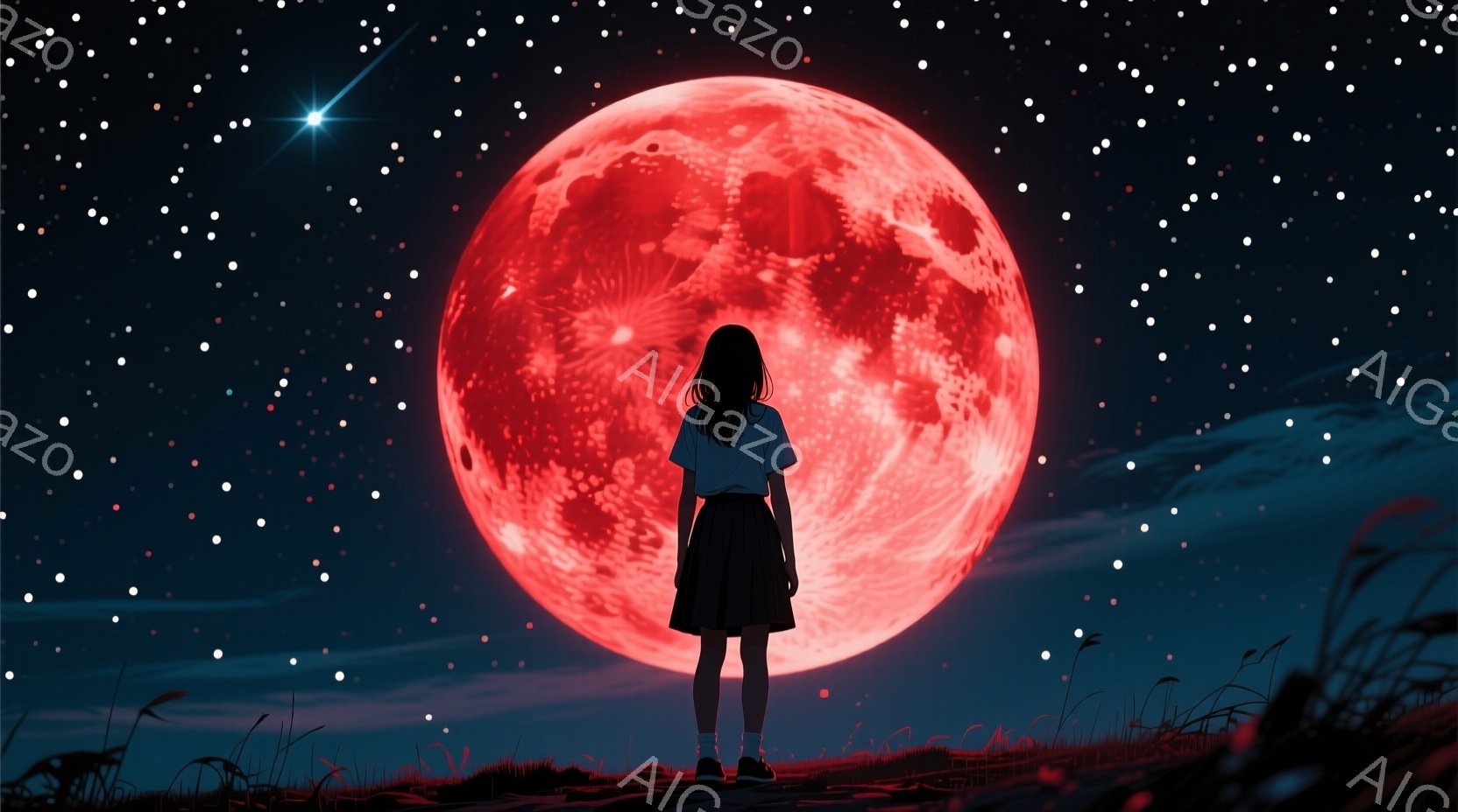 黒髪の少女が、膝丈のスカートと青いTシャツを着て、背を向けて立っている。背景には巨大な赤い月が輝き、周囲には暗いシルエットの草やキノコが点在している。全体的に静かで神秘的な雰囲気が漂い、夜空には無数の星が散りばめられている。