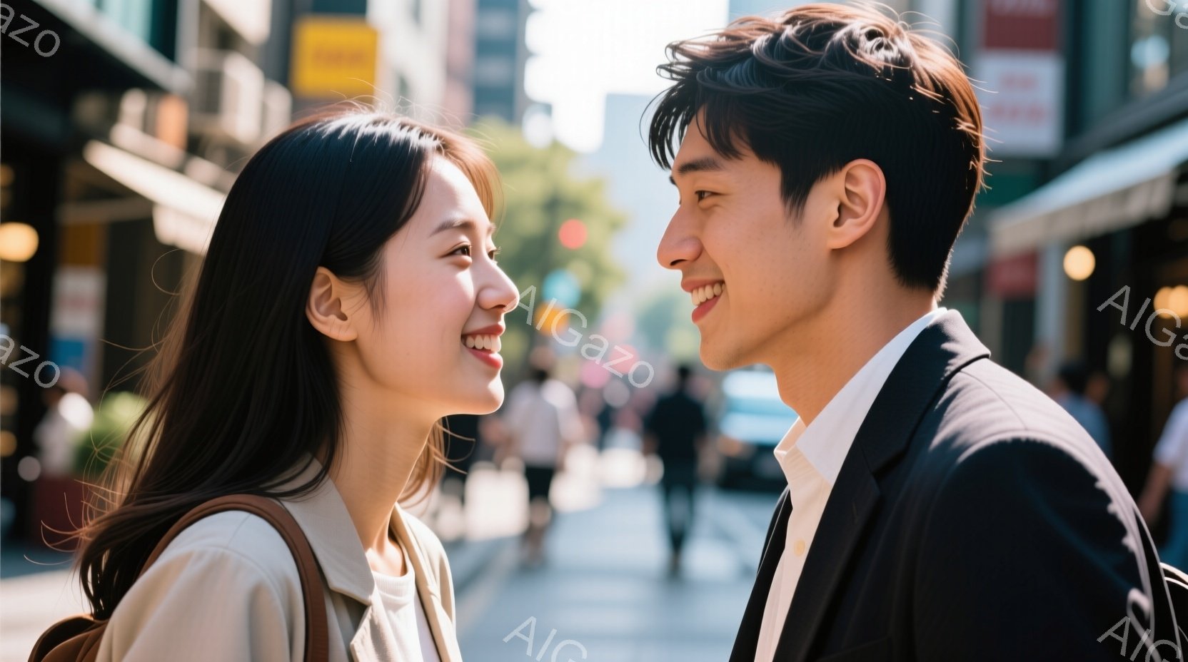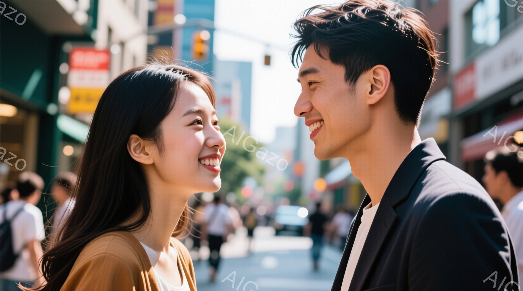 街中で寄り添う若い男女が写っている。女性は明るいベージュ色のジャケットを着て、長い黒髪を自然に垂らしており、笑顔で相手を見つめている。男性はデニムジャケットに白いシャツを着ており、リュックを背負い、女性と同じように笑顔を見せている。