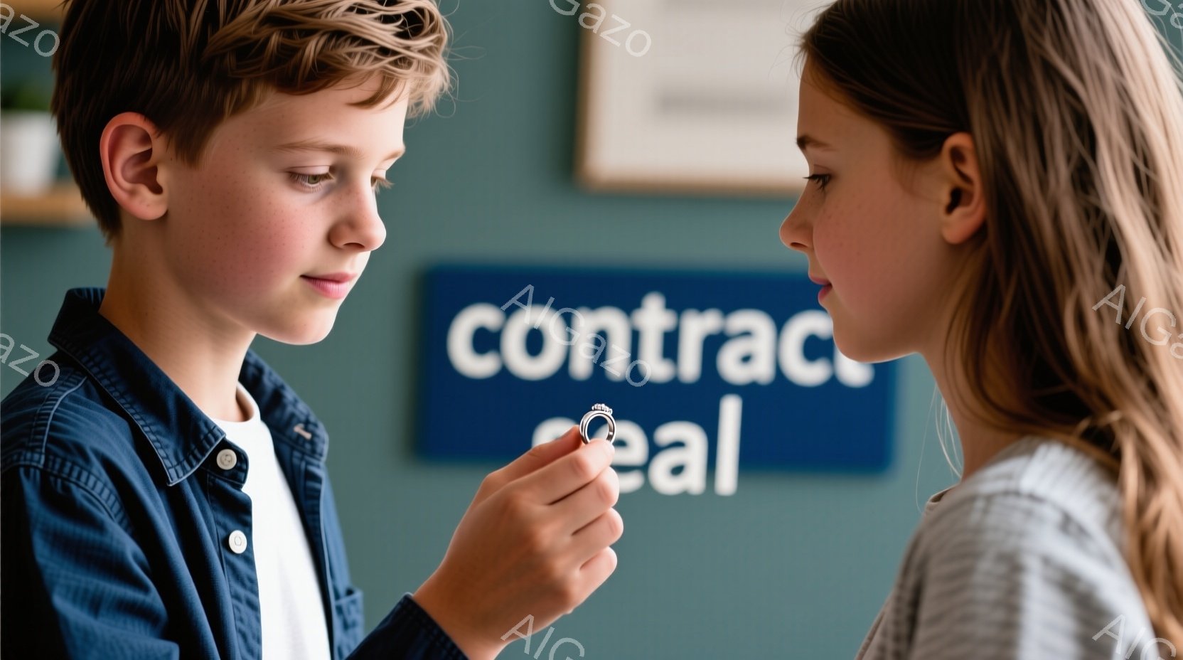 小さな男の子が、指輪を少女に差し出している場面です。男の子はネクタイと紺色のスーツを着ており、微笑みを浮かべています。少女は白いTシャツを着ており、横を向いて指輪を見つめています。