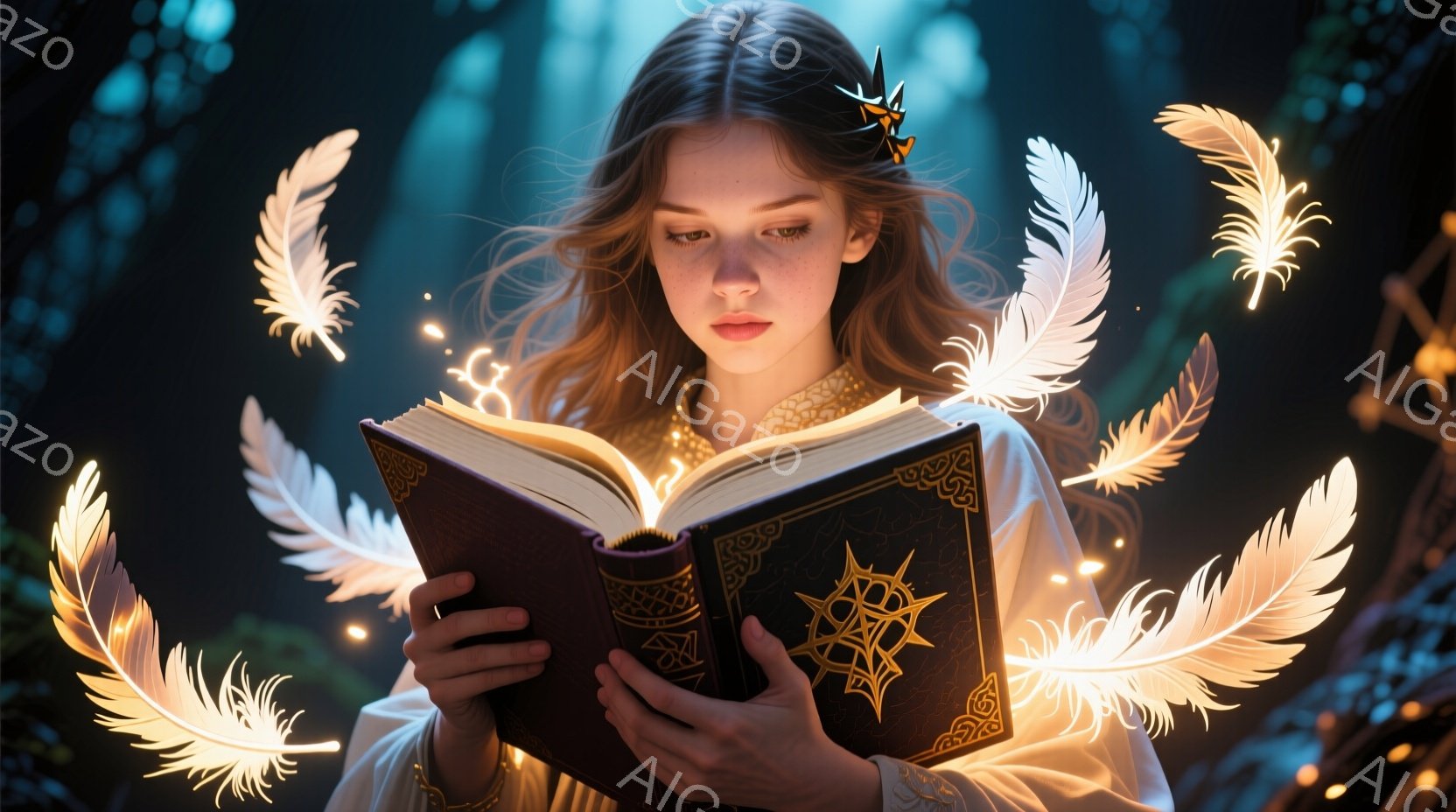 長い赤毛を緩やかに巻いた若い女性が、装飾が施された暗い表紙の大きな本を読んでいる。彼女は白いブラウスとレースの襟をつけ、真剣な眼差しで本に集中しており、顔には淡いそばかすがある。背景にはぼんやりとした自然の風景が広がり、光る羽のようなものが彼女を取り囲むように浮かび、神秘的で夢幻的な雰囲気を醸し出している。