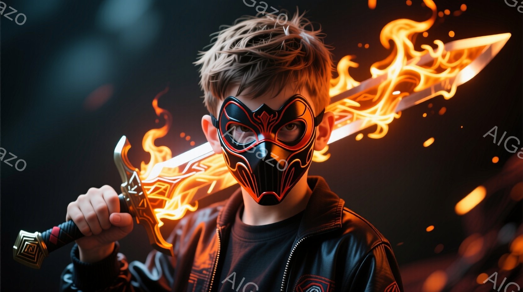 茶髪の少年が、黒いマスクと黒いパーカーを着て、燃え盛る剣を構えています。少年は鋭い眼差しで正面を見つめ、決意に満ちた表情をしています。背景は暗く、燃え盛る炎と輝く粒子が散りばめられており、力強く神秘的な雰囲気を醸し出しています。