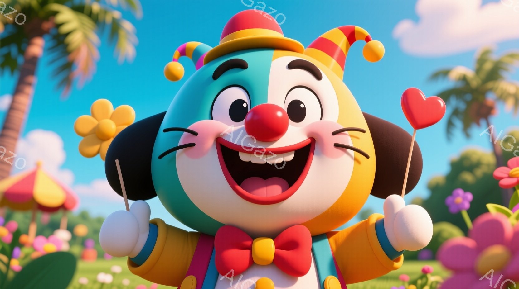 人物はロングヘア、リップスティック、笑顔を見せるカーニバルのキャラクター。ハート形のバルロンに入り、歓声を上げています。背景は豪華な色彩で、多くのバルロンとハートが特徴的なデザイン。キャラクターの雰囲気は楽しく、暖かく、カーニバルを祝うような雰囲気です。