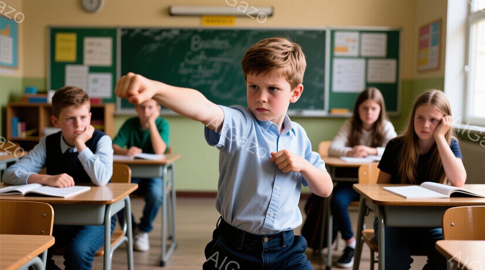 教室の中で、一人の少年が両手を握りしめ、構えを取っています。彼は短い茶色の髪を持ち、強い決意を込めた表情をしています。周囲には退屈そうな顔をした他の生徒たちが座っており、黒板には文字が書かれ、教室の雰囲気はやや緊張感があります。