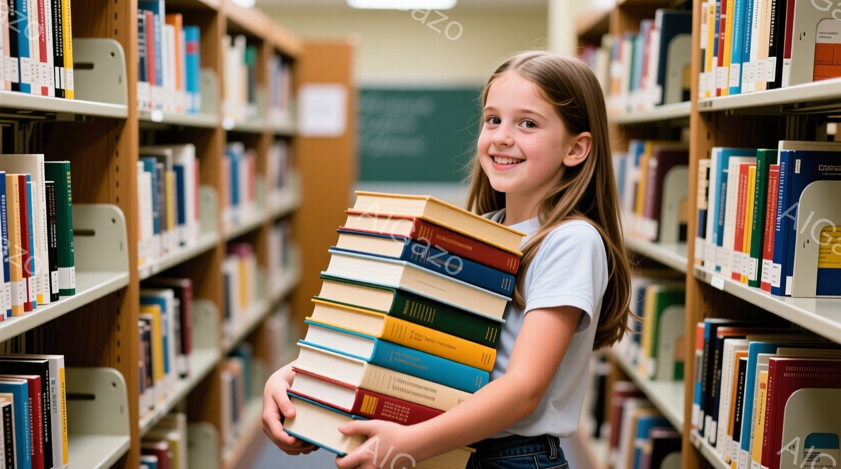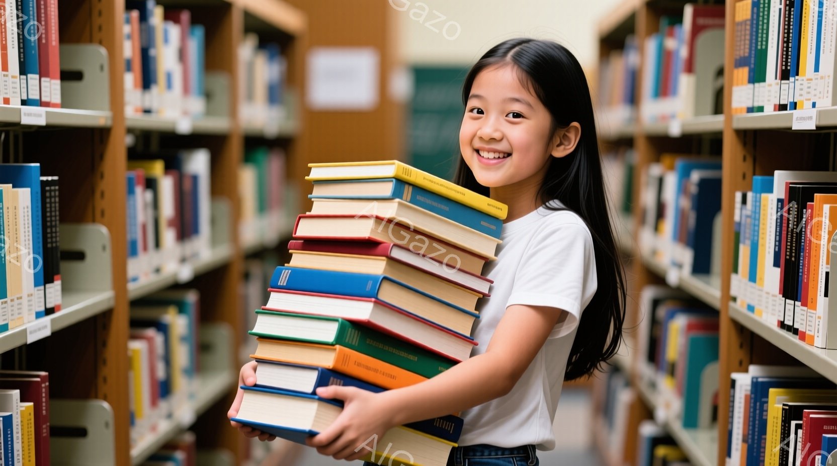図書館で、若い女性がたくさんの本を抱えています。彼女は白いTシャツとジーンズを着ており、長く黒い髪は肩にかかっています。笑顔でカメラを見つめており、本に囲まれた背景は、学習や知識へのアクセスを連想させ、明るくポジティブな雰囲気を作り出しています。