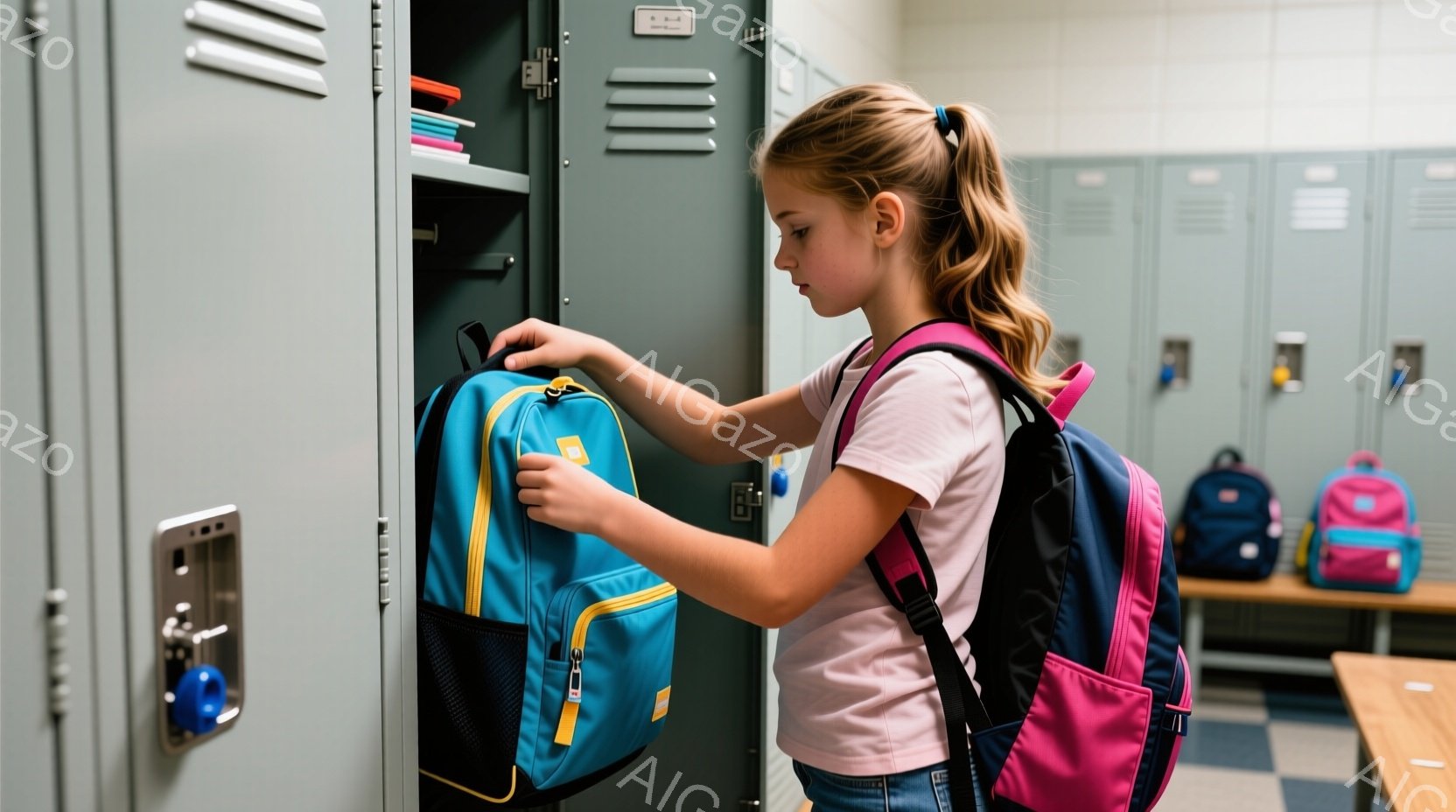学校のロッカーの前で、若い女の子が青とピンクのバックパックを扱っている。彼女はピンク色のTシャツを着ており、髪はポニーテールに結ばれている。背景には、他のロッカーが並んでおり、学校内の廊下の様子が伺える。