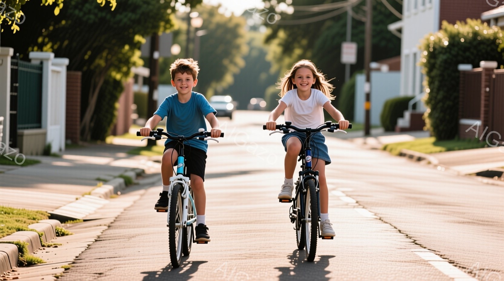 二人の子供が、住宅街の道路を自転車で走っている様子が写っている。少年は青いTシャツと短いズボンを身につけ、短い茶色の髪をしている。少女はピンク色のTシャツとジーンズのショートパンツを着用し、髪は後ろでポニーテールに結ばれている。