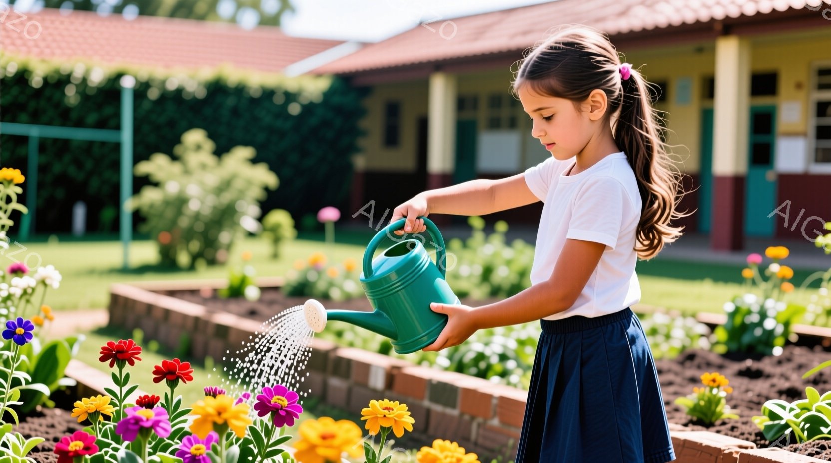 茶髪をポニーテールにした少女が、花壇に水をやっています。白いシャツに紺色のスカート、赤いリボンが可愛らしい制服を着ており、真剣な表情で植物に水を与えています。背景には木製の花壇と緑の芝生、そしてクリーム色の建物が見え、晴れた日の穏やかな雰囲気が感じられます。