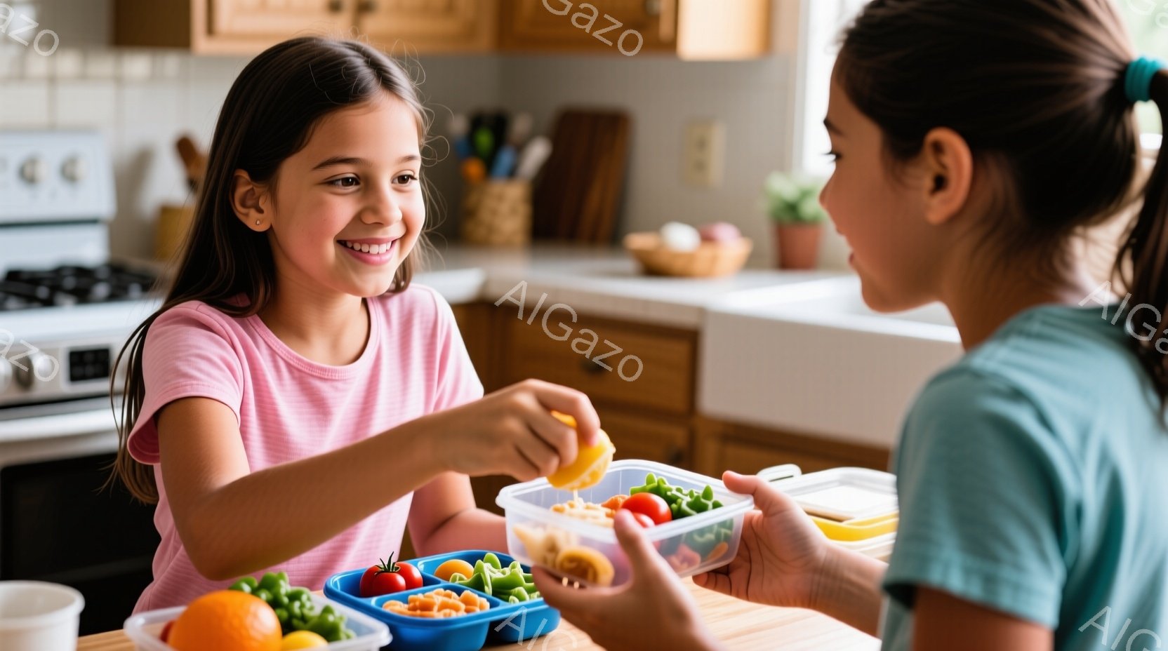 少女がキッチンでランチボックスを手にしている様子が写っています。ピンク色のTシャツを着ており、満面の笑みを浮かべ、髪は後ろで結んでいます。背景には、青色のキャビネットと調理器具が見え、明るく温かい家庭的な雰囲気が漂っています。