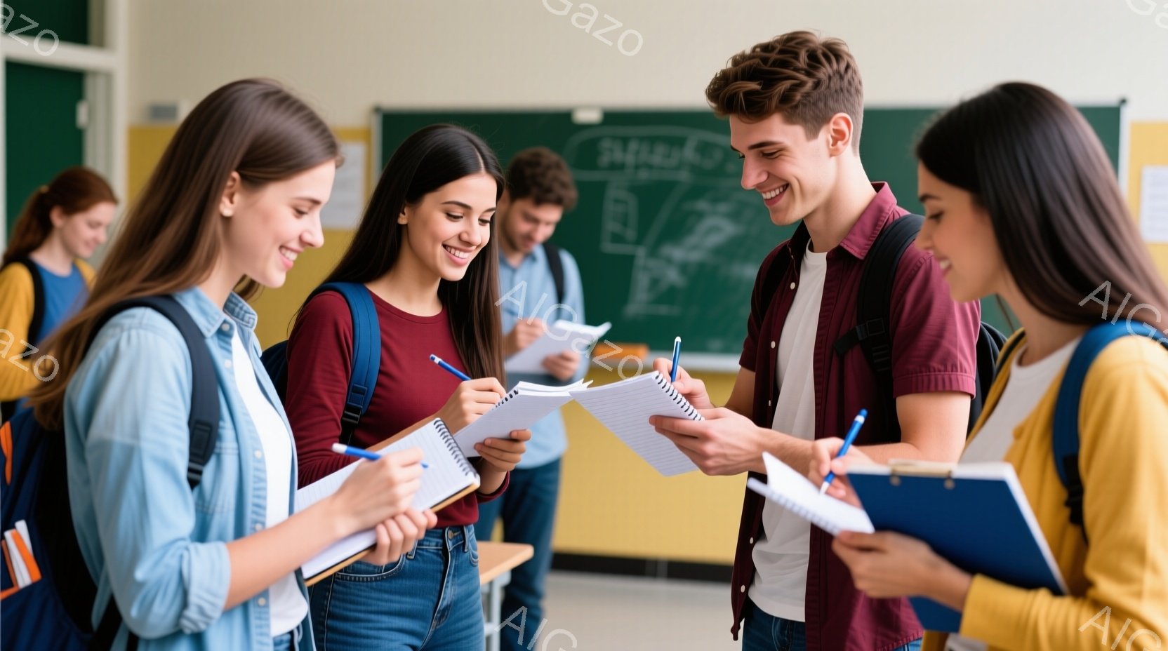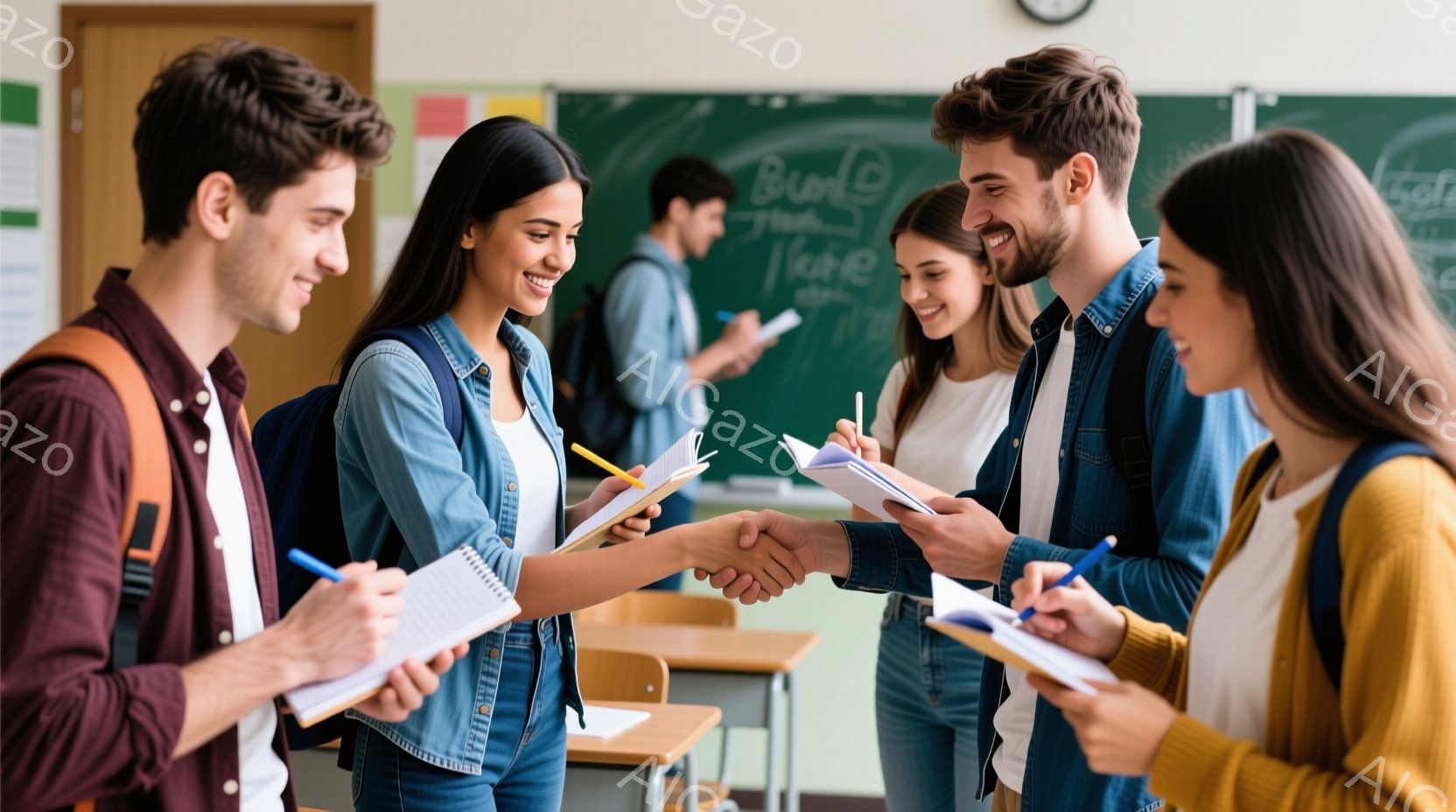 若者たちが教室で握手を交わしている様子が写っている。彼らは皆、カジュアルな服装で、ジーンズとセーターやジャケットを着ている。背景には黒板があり、教室の雰囲気を示している。