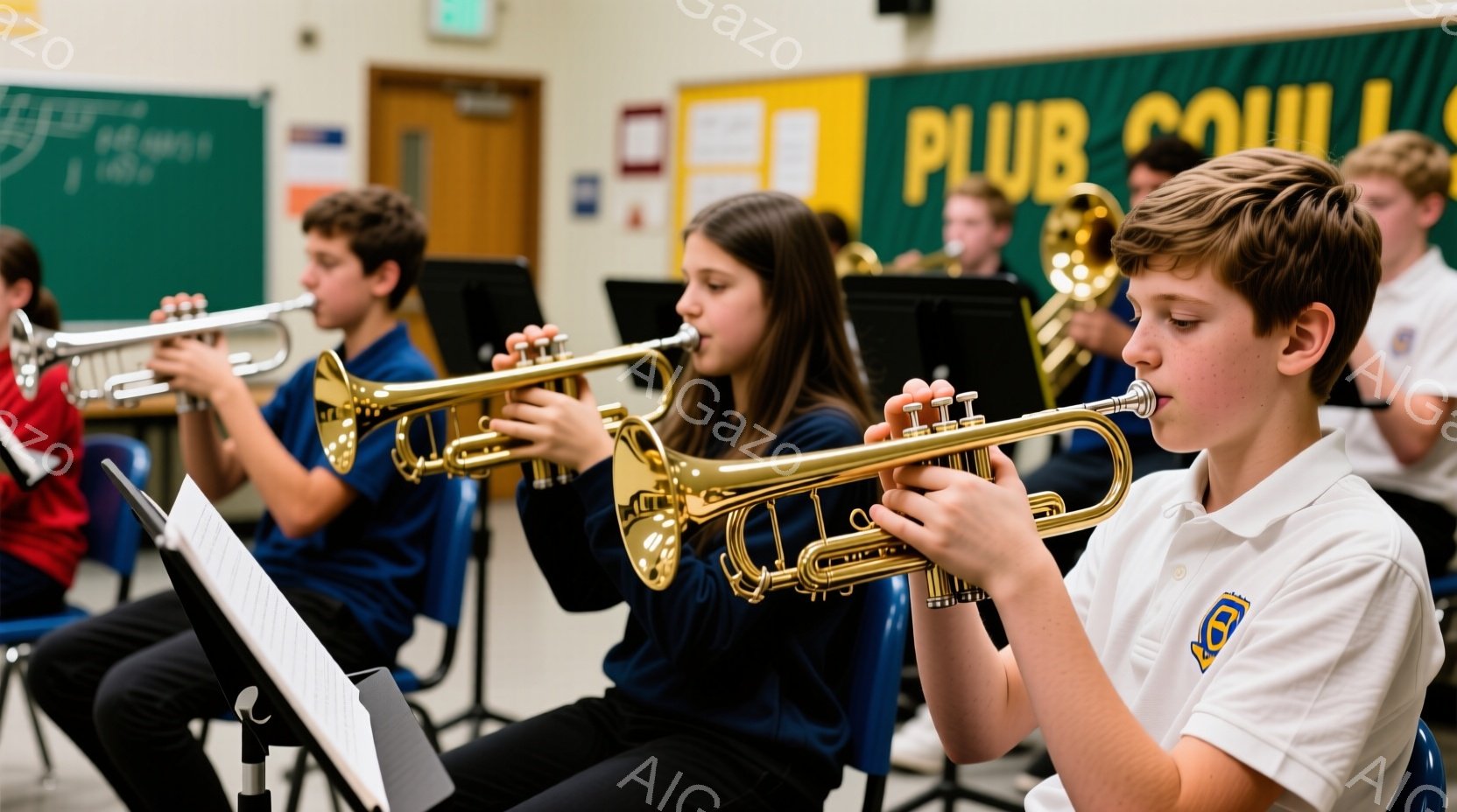 吹奏楽団の生徒たちが金色のトランペットを演奏している様子が写っています。生徒たちは濃い青色の制服を着ており、集中した表情で楽器を構えています。背景には、他の金管楽器や楽譜が置かれた教室があり、活気のある練習風景が伝わってきます。