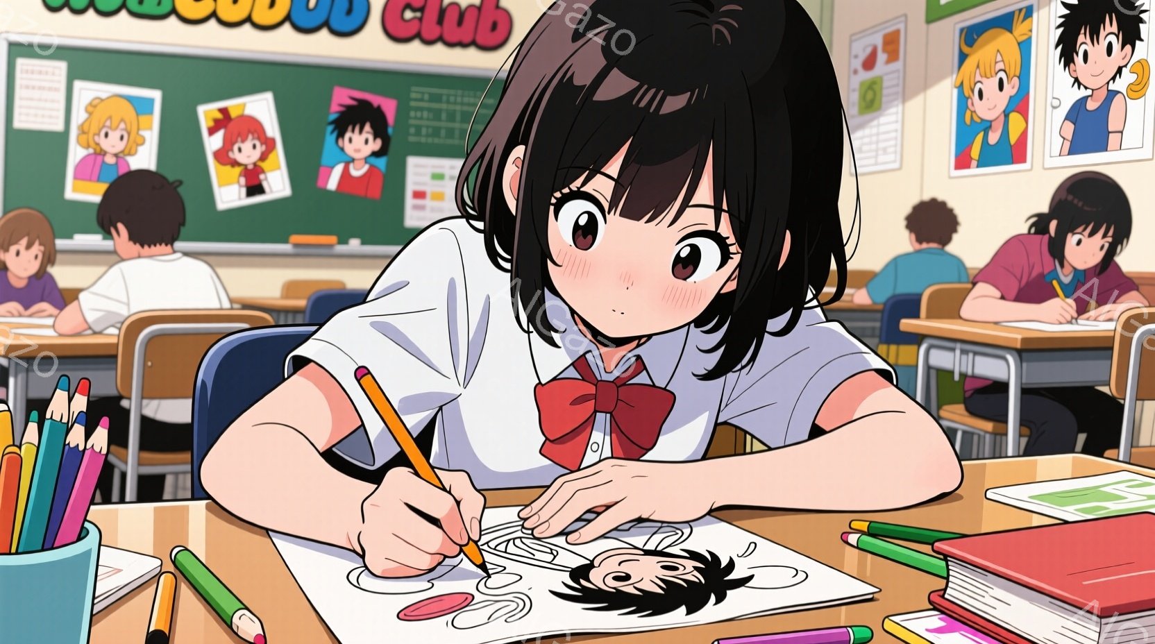 この無料AI生成画像「教室の様子で、一人の女子生徒が前かがみになり、何かを描いている様子が描かれています。彼女はセーラー服を着ており、長い黒髪をしています。周りには他の生徒もいますが、彼女に焦点が当てられています。」は、2025年10月26日に作成されました。 サイズは 1664×928px の高解像度で、商用利用も可能なフリー素材として提供しています。