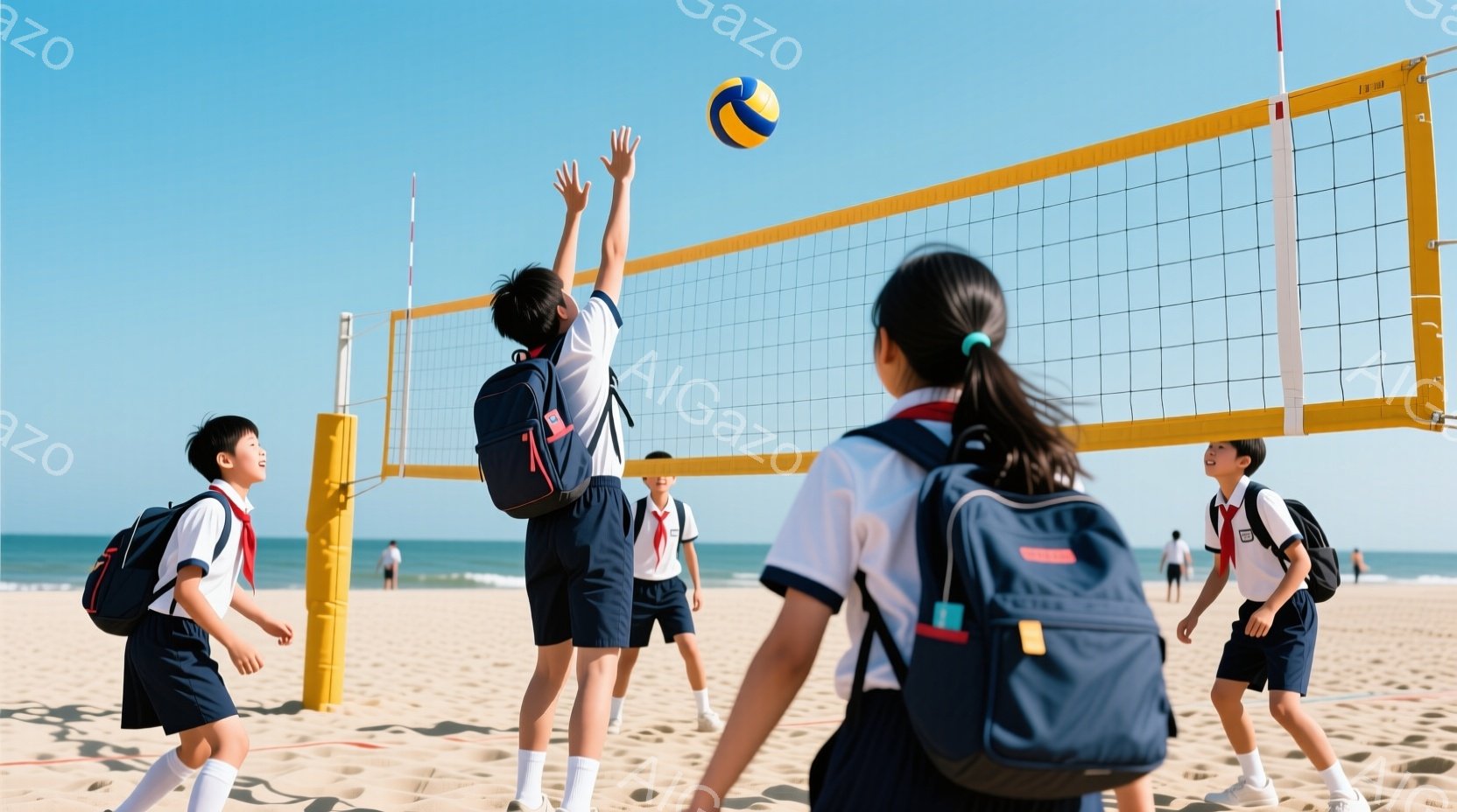 制服姿の学生たちが砂浜でバレーボールをしている写真です。男子生徒は白いシャツに紺色の短パン、女子生徒は白いブラウスに紺色のスカートを着用し、白い靴下とスニーカーを履いています。背景には青い空と海が広がり、天候は晴れで、全体的に活気があり、若々しい雰囲気です。