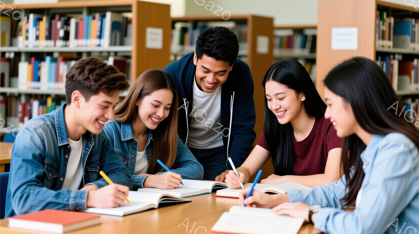 図書館の一室で、若い男女5人が机を囲んで勉強している様子が写っている。彼らは皆、カジュアルな服装で、笑顔を浮かべながらノートに何か書き込んでいる。背景には本棚が並び、明るく穏やかな学習の雰囲気が漂っている。