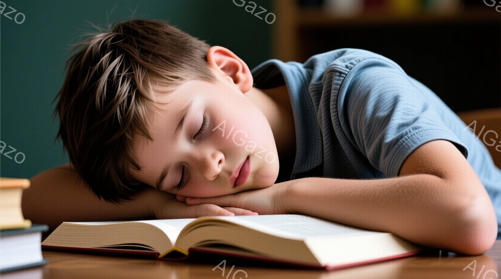 若い男の子が机の上で眠っており、頭を腕で支えています。彼は青いTシャツを着ており、短くてカールした茶色の髪をしています。机の上には開かれた本と積み重ねられた本が置かれ、背景にはぼやけた木製の家具が見えます。