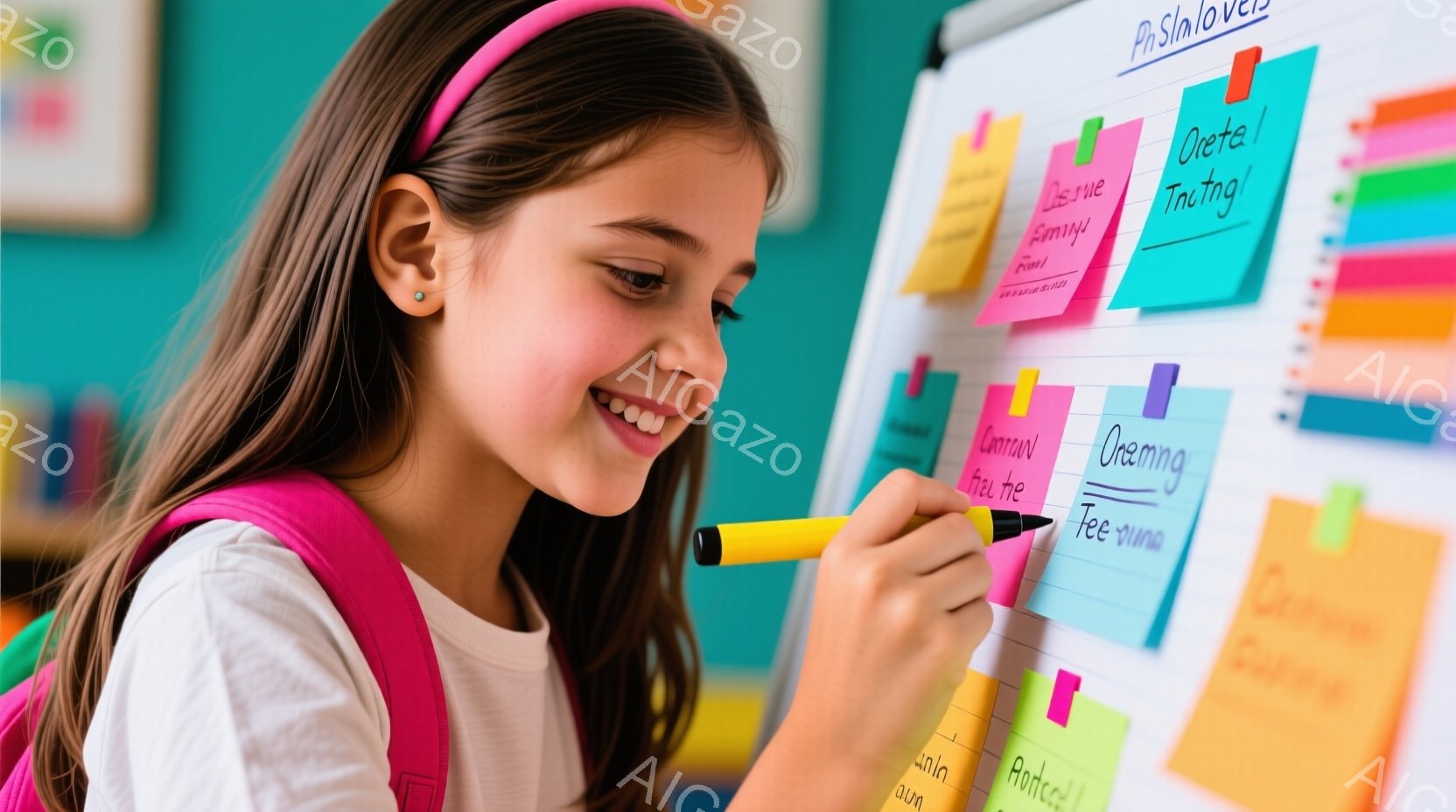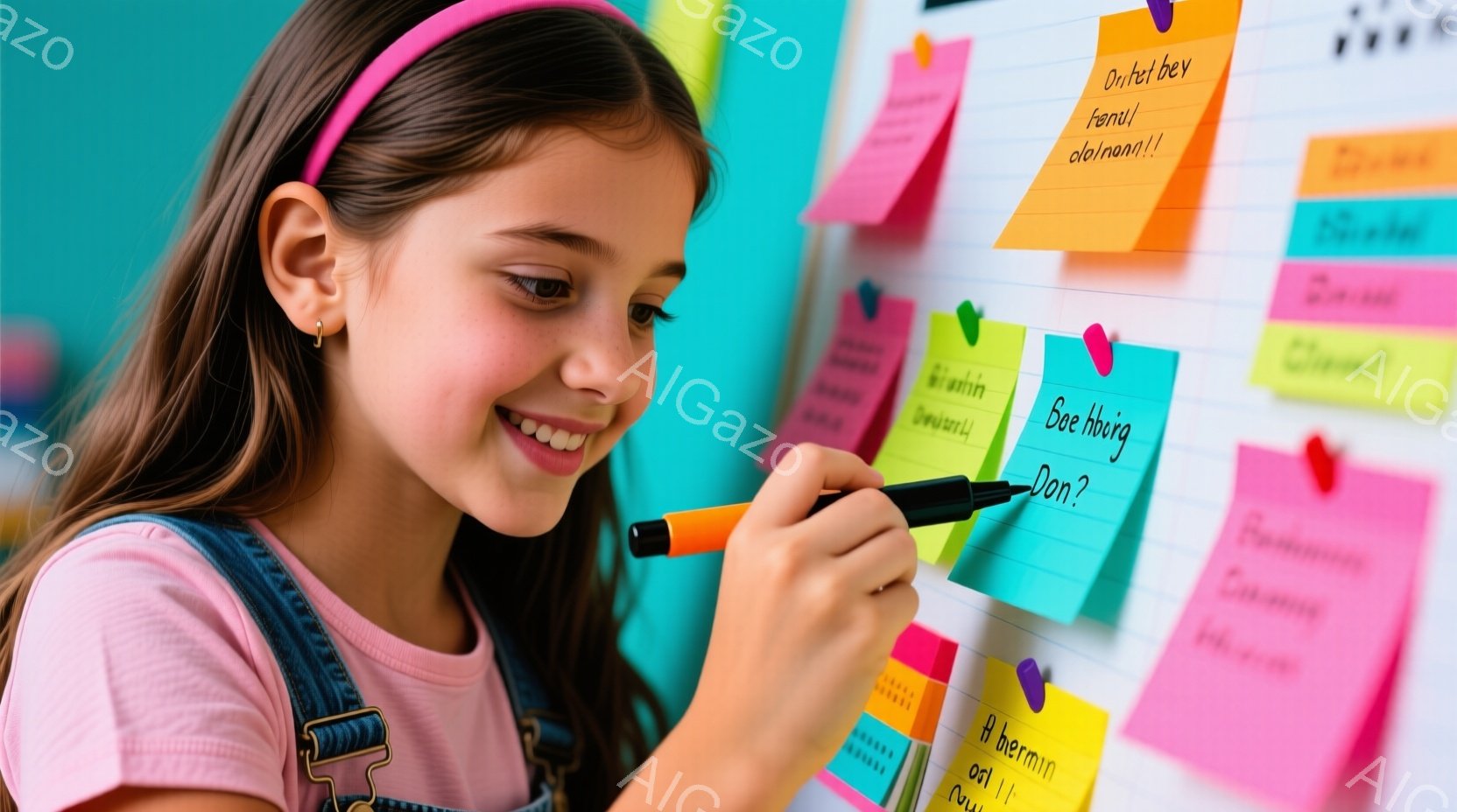 少女は、青いパーカーを着て、手にペンを持って、ポストイットのブックに紙封筒を貼り付けています。彼女は吃息し、表情が明るく幸せそうです。彼女は緑色の壁の前に立っており、彼女は準備書き物を飲んでいるような姿勢で、手がパーカーの腕上にあります。絵は明るく、ポジティブな雰囲気が感じられます。