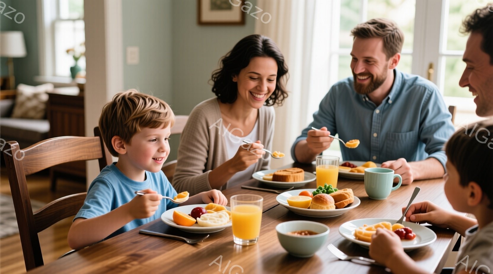 明るいキッチンで、家族が朝食をとっています。母親は明るい色のトップスを着て微笑み、フォークで食べ物を口に運んでいます。少年は青いTシャツを着て、真剣な表情で自分のプレートの食べ物を食べています。