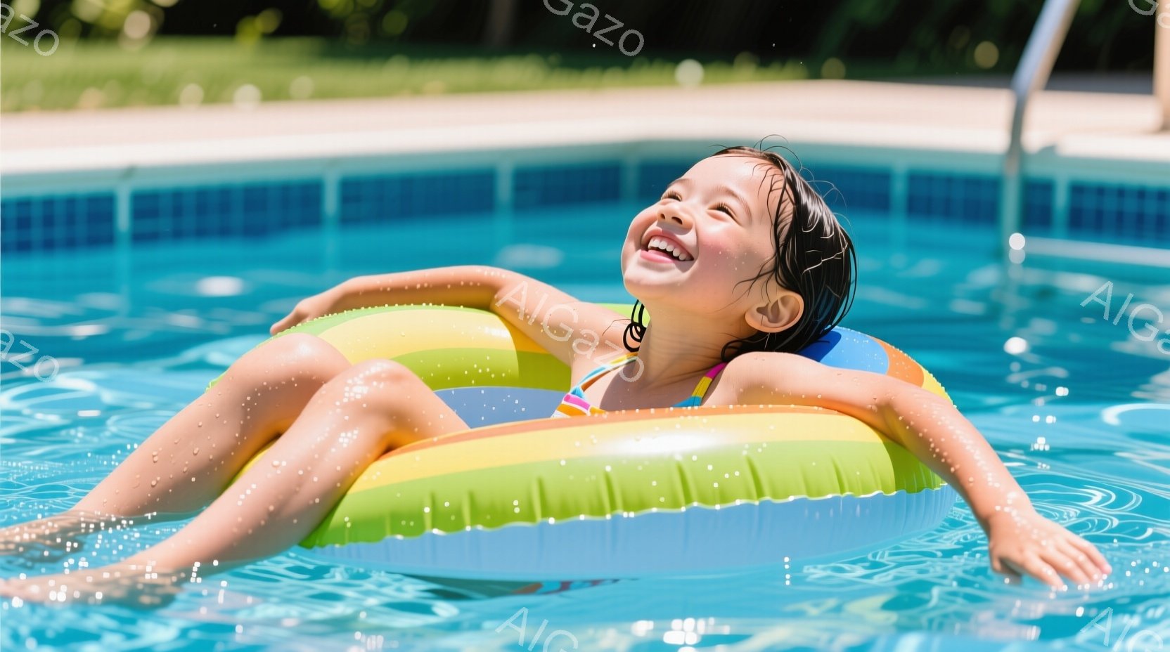 金髪で水着姿の少女がプールに浮かぶ浮き輪の上で笑顔で仰向けになっている。彼女はゴーグルをつけており、水しぶきが肌に光っている。背景には青い空と緑の木々が見え、晴れた日のプールでの楽しいひとときを捉えた写真である。