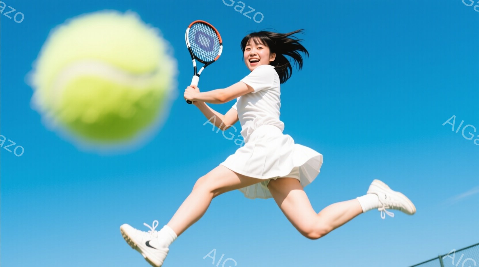 白いポロシャツと白いスカートを着用した女性が、テニスラケットを振りかぶり、テニスボールを打とうとしている瞬間を捉えた写真です。彼女は髪をポニーテールにし、笑顔で躍動感のある姿勢を見せています。背景には緑のネットと青空が広がり、晴れた日のテニスコートの活気ある雰囲気が伝わってきます。