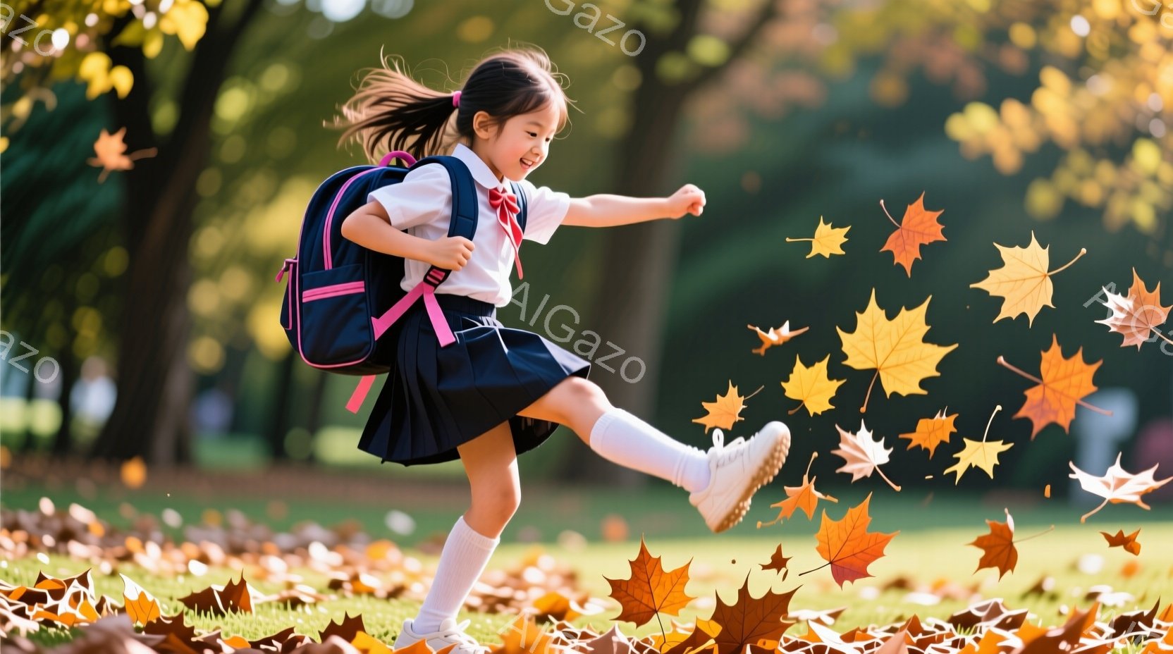 茶色の落ち葉が舞う緑の芝生の上で、紺色のスカートと白いシャツを着た少女が、片足を高く上げて活発に歩いている。黒髪をポニーテールにし、リュックサックを背負っている彼女は、楽しそうに秋の風景の中を駆け抜けているようだ。背景には木々が生い茂り、明るい日差しが差し込み、全体的に暖かく、陽気な雰囲気を醸し出している。