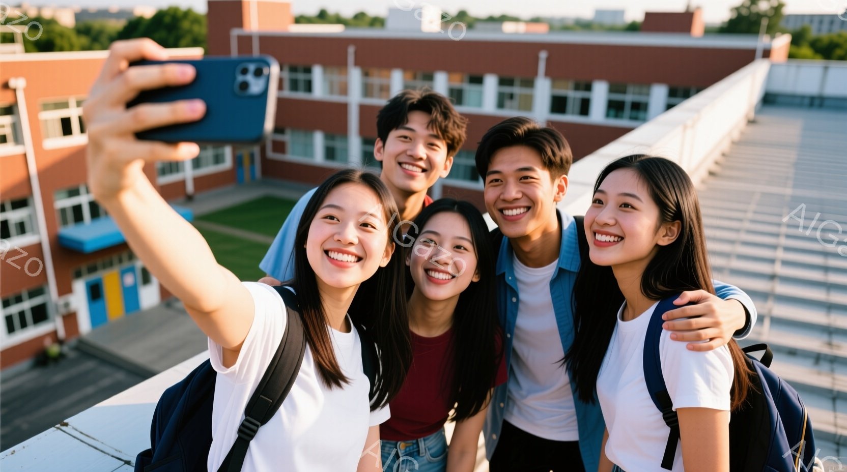 若い男女4人が肩を寄せ合い、自撮りをしている写真です。全員が笑顔で、カジュアルな服装をしています。背景にはレンガ造りの建物が見え、晴れた空の下、明るく楽しい雰囲気が伝わってきます。