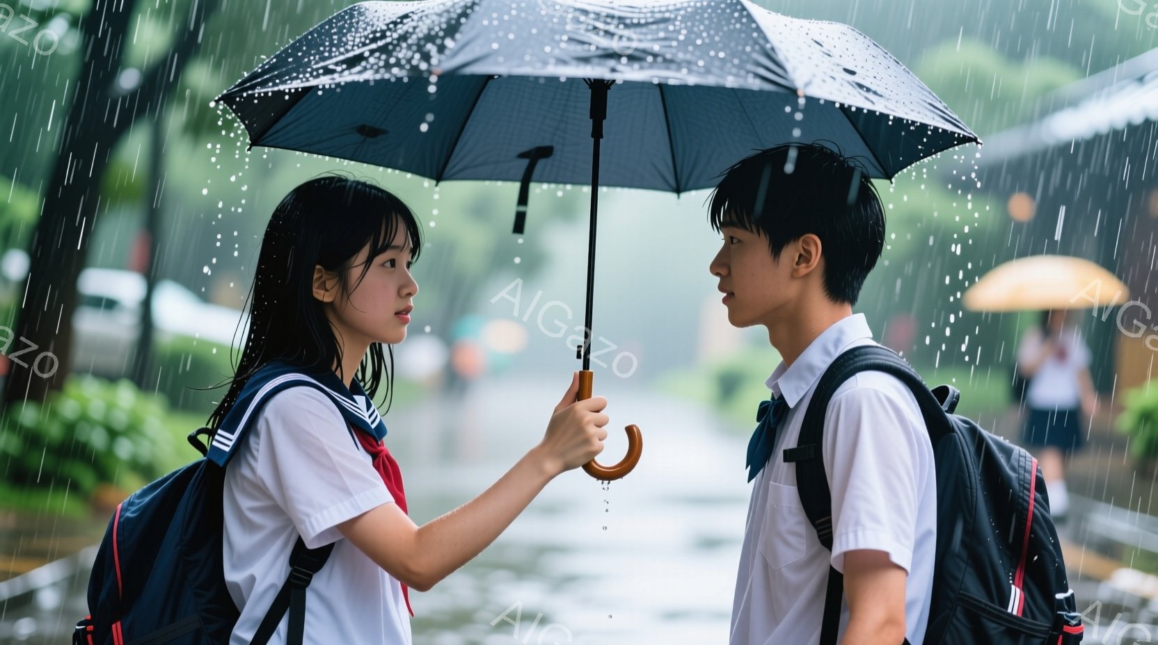 制服姿の二人の女子高生が、雨の中で向き合っている。彼女たちはどちらも黒髪で、白いシャツに赤いネクタイ、そしてリュックサックを背負っている。背景には学校の建物が見え、激しい雨が降っている様子から、少し憂いを帯びた雰囲気が漂っている。