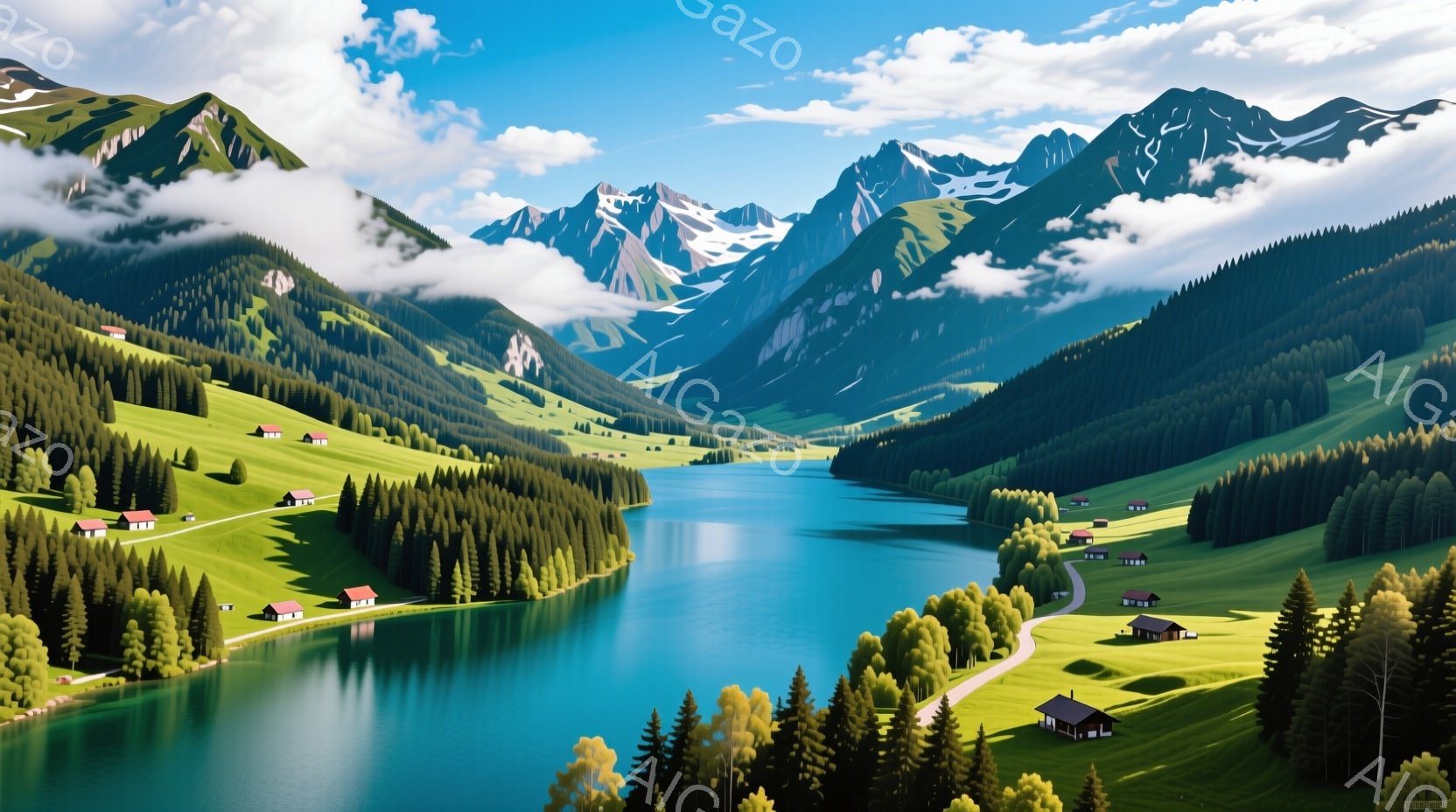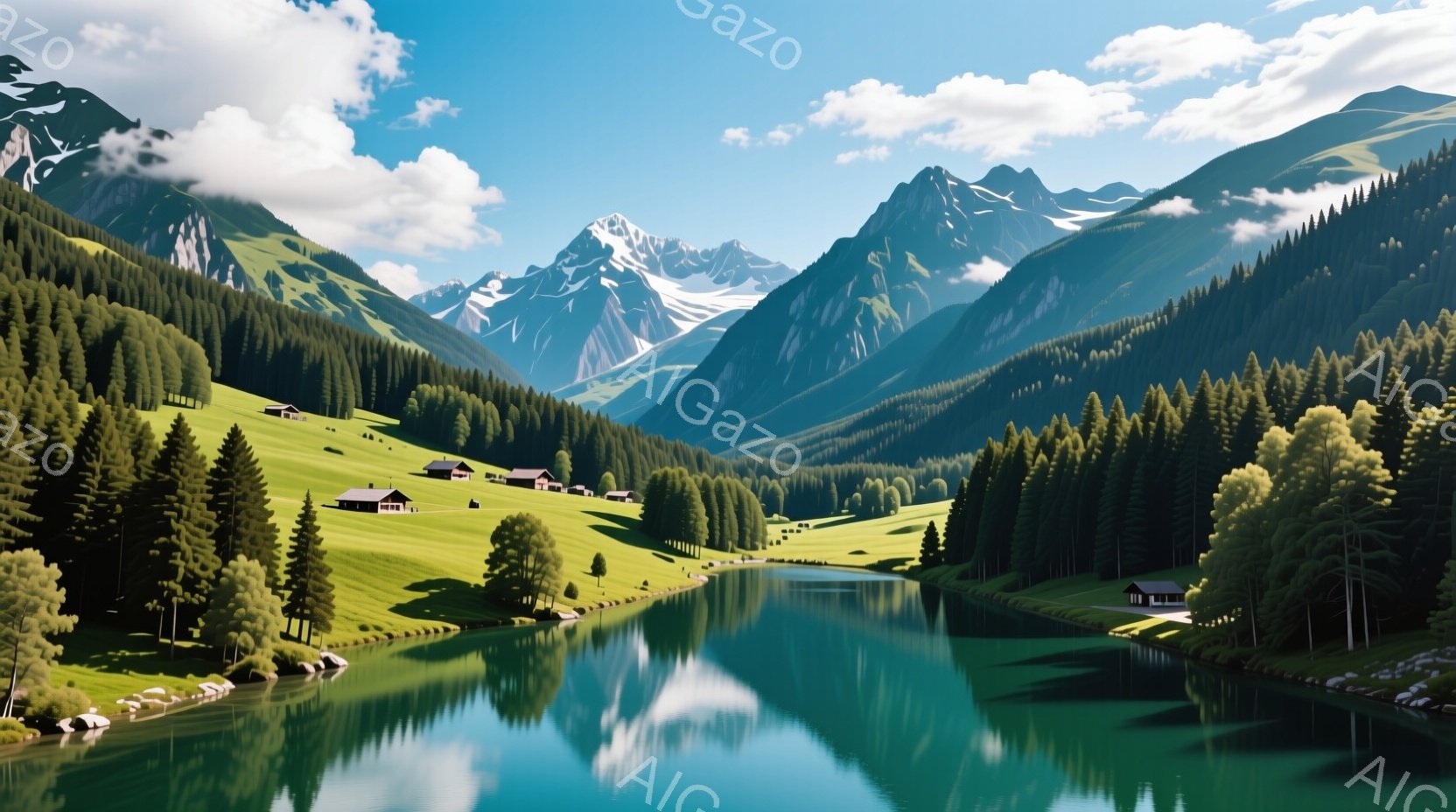 険しい山々とエメラルドグリーンの湖が広がる風景です。山頂は雪に覆われ、山肌には緑豊かな森林が広がっています。湖面は静かで、山々と空の鮮やかな反射が映り込み、穏やかな雰囲気を醸し出しています。