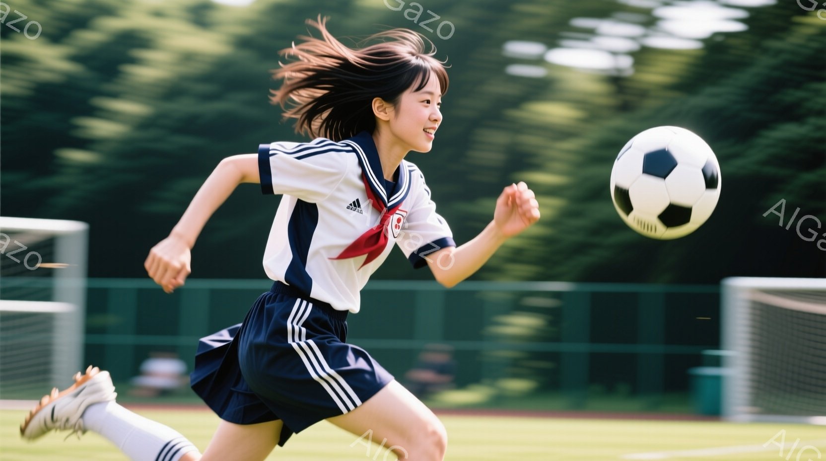 この無料AI生成画像「緑の芝生の上を走る若い女性が写っています。彼女は白と紺のストライプのサッカーユニフォーム、紺のソックス、そして白いスニーカーを着用し、長い黒髪を後ろで結んでいます。彼女はボールを追いかけながら走っており、顔には笑顔が見られ、活気のある雰囲気が漂っています。」は、2025年10月22日に作成されました。 サイズは 1664×928px の高解像度で、商用利用も可能なフリー素材として提供しています。