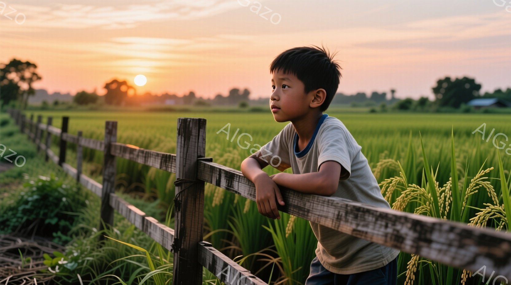 少年は、緑豊かな田んぼに囲まれた木製の柵にもたれかかって立っている。白いTシャツを着ており、短く刈り込まれた黒髪は、少し憂いを帯びた横顔を強調している。背景には夕焼けの空が広がり、暖かく穏やかな雰囲気を醸し出している。