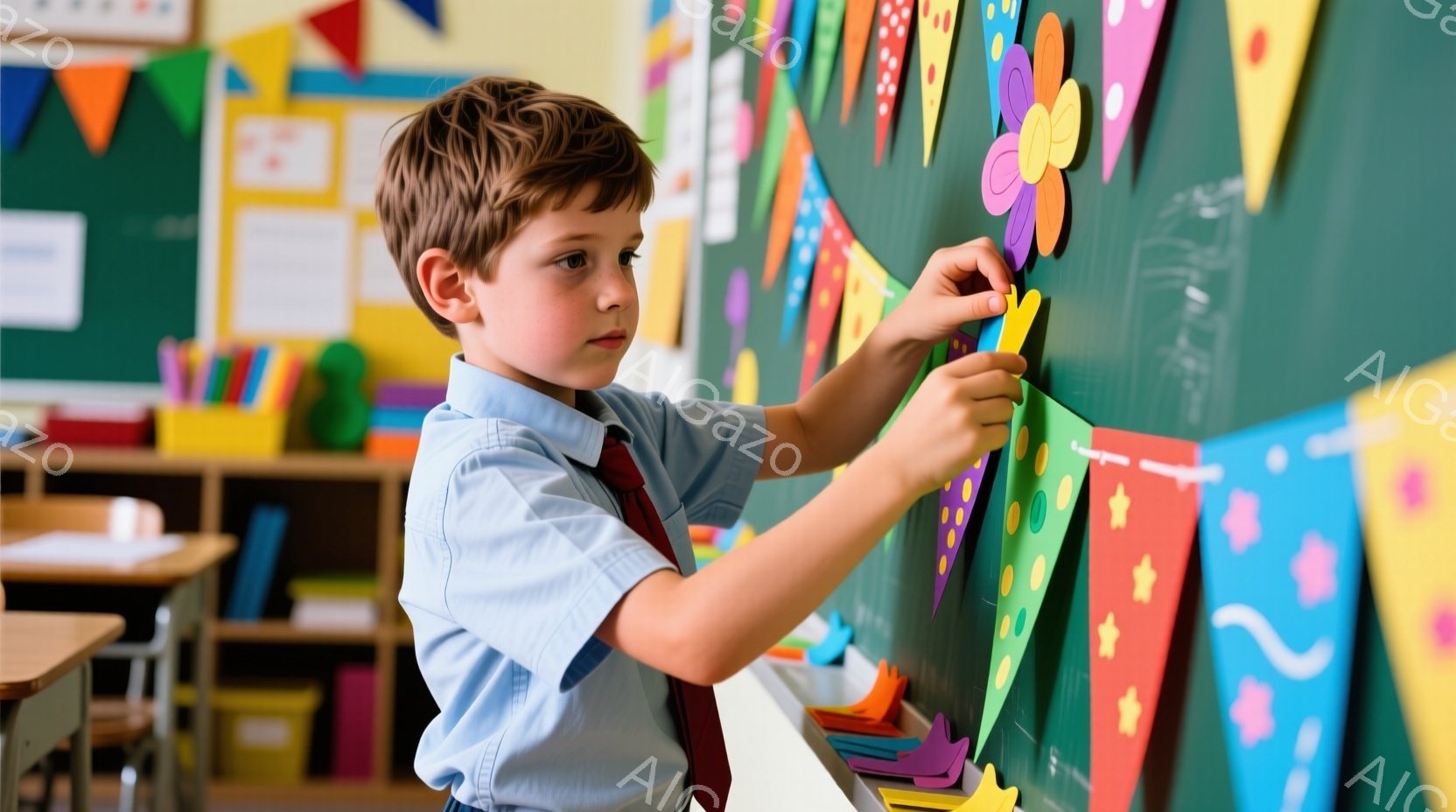 男の子がカラフルな旗のガーランドを緑色の壁に飾り付けている。彼は白いシャツと濃い色のネクタイを着ており、短い茶色の髪をしている。背景には他の生徒と机があり、明るく活気のある教室の雰囲気を感じさせる。