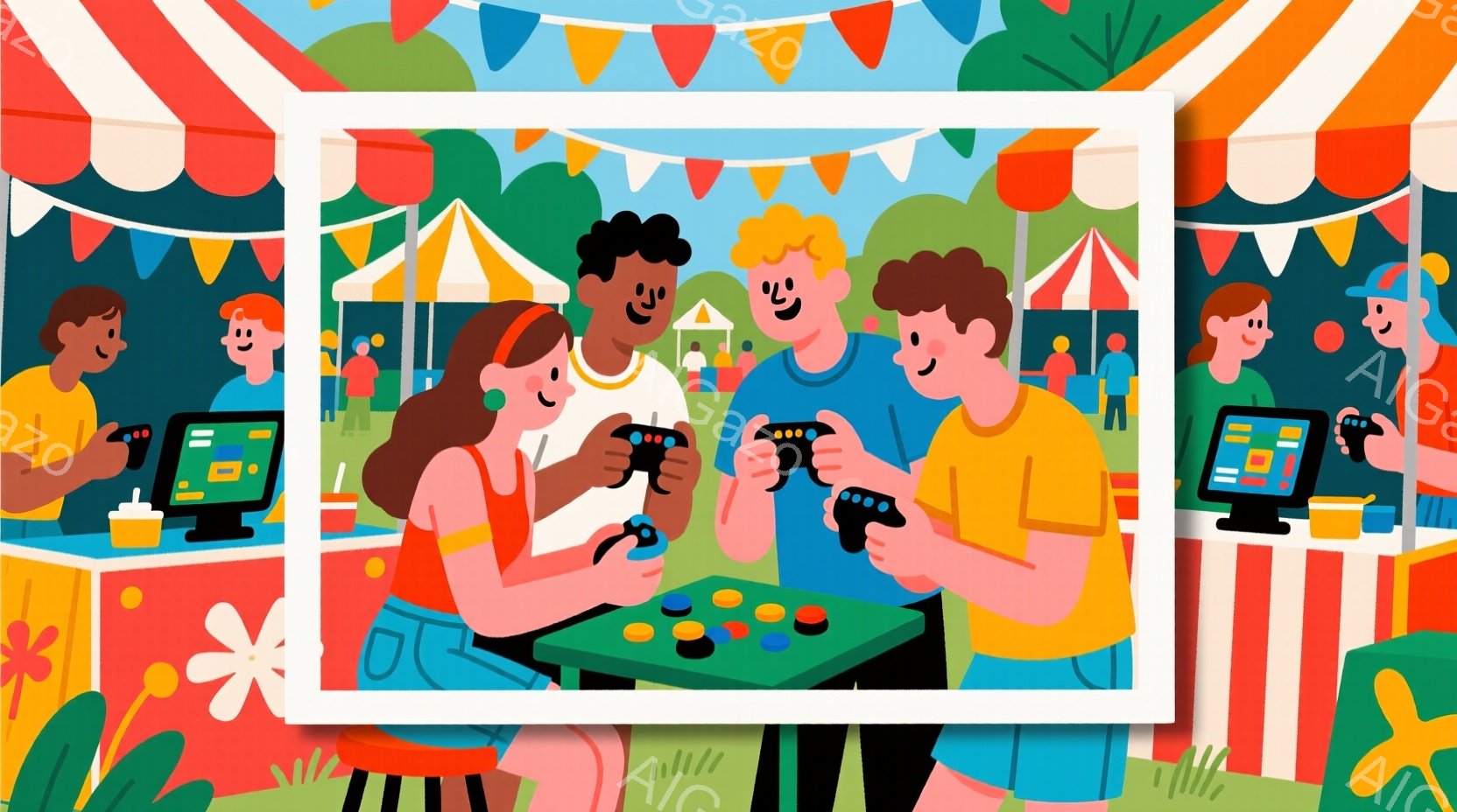 イラストは、屋外のイベントやフェスティバルを思わせる賑やかな光景を描いています。人々はテーブルを囲んでゲームを楽しんでおり、それぞれがカラフルなTシャツやカジュアルな服装をしています。背景には、緑豊かな植物やカラフルな旗が飾られたテントが見え、明るく陽気な雰囲気を醸し出しています。