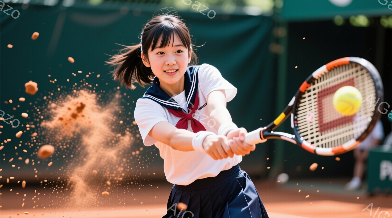 少女はテニスコートでフォアハンドのショットを打っています。白いポロシャツに黒いスカートを着用し、髪はポニーテールに結ばれています。背景には緑のネットとオレンジ色の土のコートが見え、活気あるスポーツの雰囲気が伝わってきます。