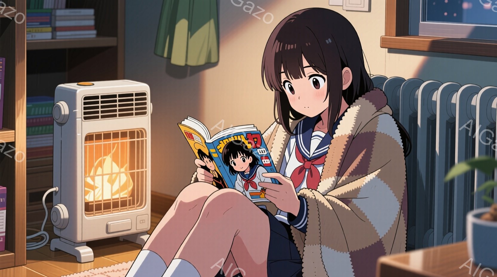 明るい色のセーターの上に紺色のブレザーを着た少女が、クリーム色の毛布にくるまってソファーに座り、本を読んでいます。彼女は黒髪のショートヘアで、少し頬を赤らめて微笑んでいます。背景には、オレンジ色の光を放つ石油ストーブと、暗い窓が見え、暖かく穏やかな冬の日の午後を思わせる雰囲気です。