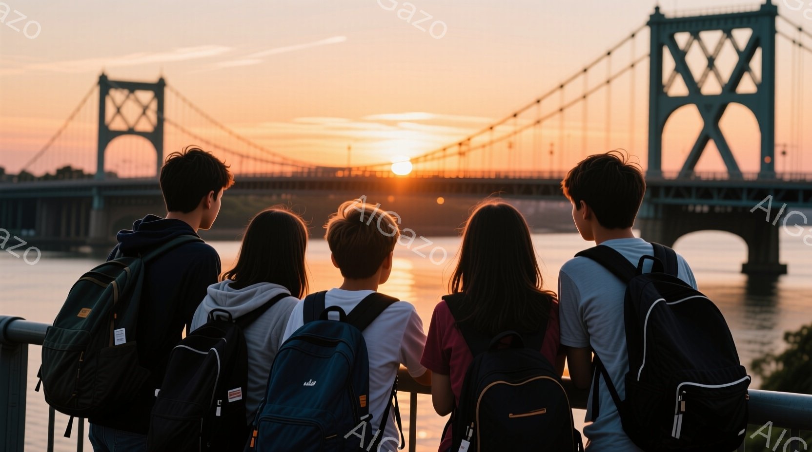 若者グループが橋の上で夕日を眺めている。彼らは皆、バックパックを背負い、カジュアルな服装で、後ろ姿のみが見える。夕焼け空はオレンジとピンクの色合いで、橋の金属構造と対照的で、穏やかでノスタルジックな雰囲気を作り出している。