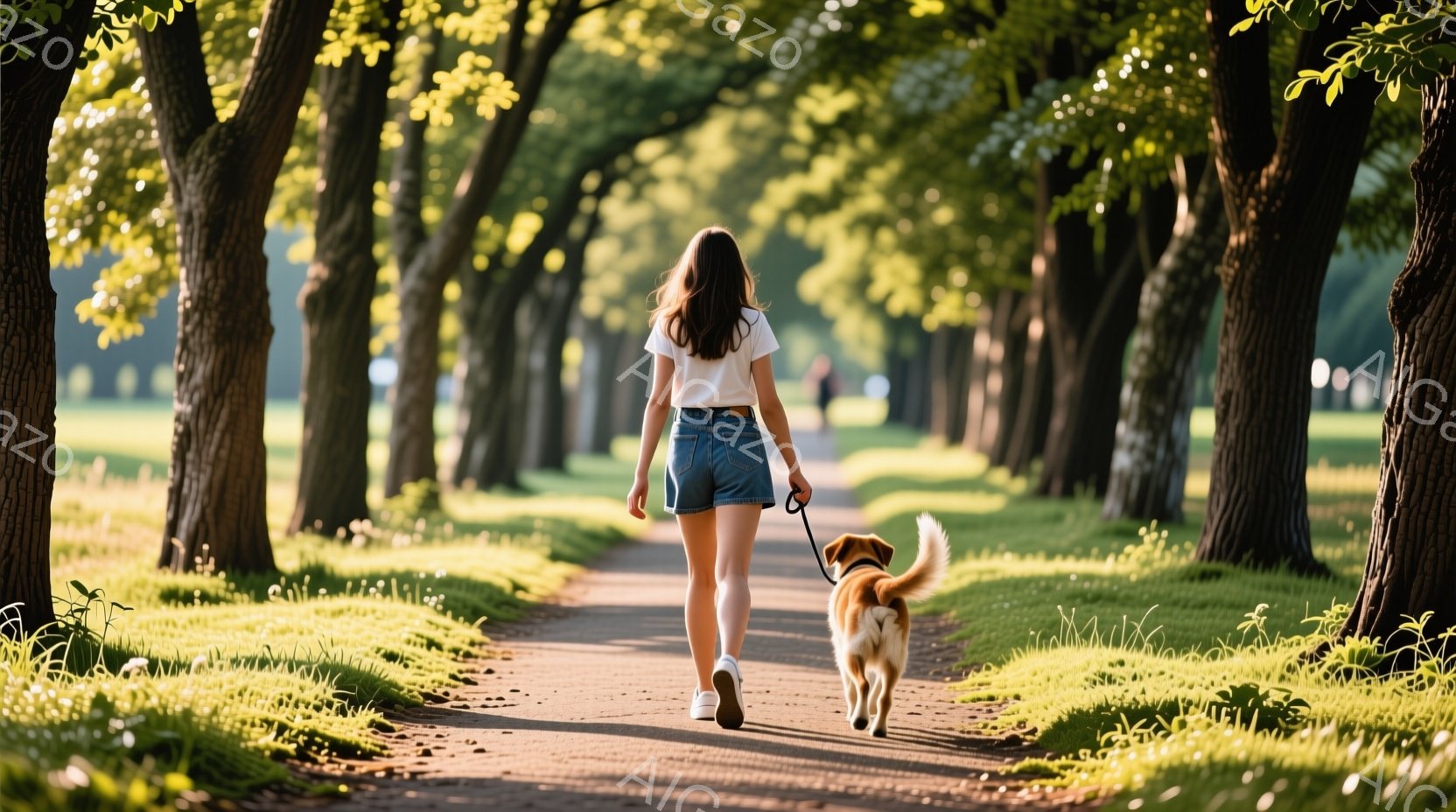 若い女性が、短いデニムパンツと白いTシャツを着て、金色のレトリバー犬を連れて舗装された道を歩いている。木々が生い茂る道の両側には緑の草が生え、背景には明るい空が見え、晴れた日の穏やかな散歩の雰囲気が漂っている。犬はリードに繋がれ、女性の後ろを歩いており、二人とも遠近法によって小さく見える。