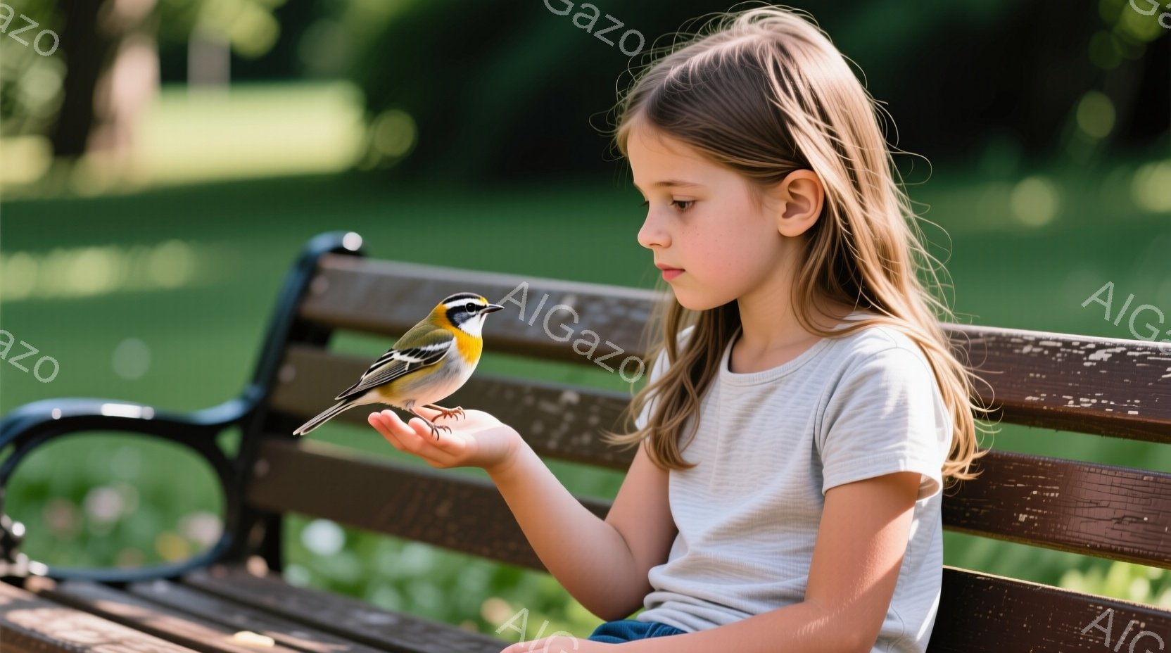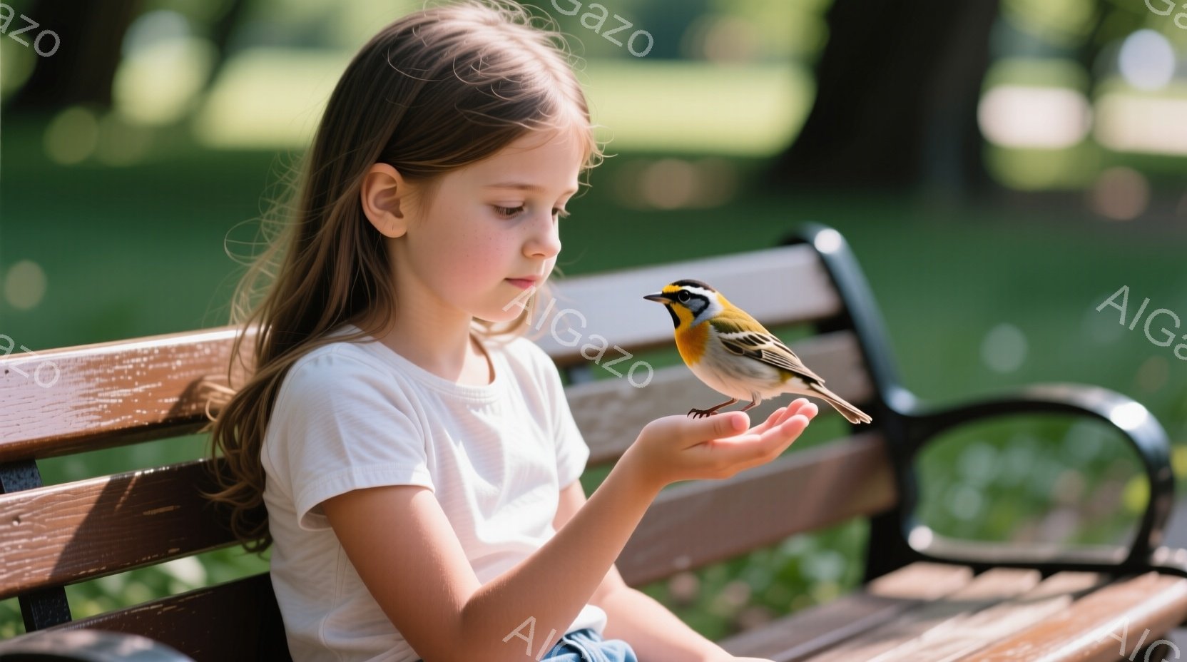 金髪の少女がベンチに座り、手のひらに雀が止まっています。彼女は白いTシャツとジーンズを着ており、長くストレートの髪は肩にかかっています。背景には緑豊かな自然が広がり、柔らかい光が差し込んで穏やかな雰囲気を作り出しています。