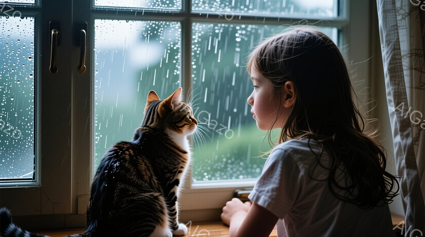 長い茶色の髪の少女が、窓の外をじっと見つめています。白いシャツを着ており、姿勢はリラックスしています。窓の外は雨が降り、水滴が窓ガラスを覆っており、全体的に穏やかで少し物憂げな雰囲気です。
