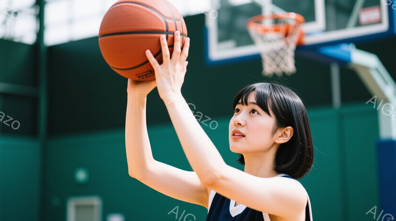 バスケットボールコートでシュートを打つ若い女性が写っています。彼女は紺色と白のバスケットボールユニフォームを着ており、短い黒髪で、集中した表情をしています。背景にはバスケットゴールが見え、コートは緑色の床で、全体的に活気がありスポーティーな雰囲気です。