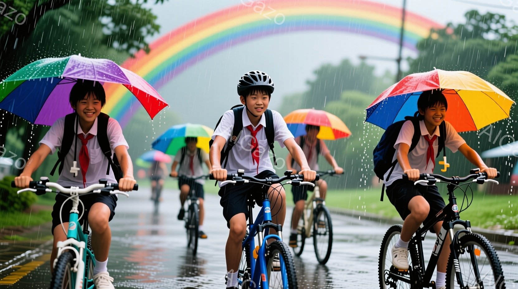 雨の中を自転車に乗る小学生たちが写っています。制服を着て、それぞれカラフルな傘をさし、笑顔で前を見つめています。背景には虹がかかり、緑豊かな木々や建物が見え、雨上がりの希望に満ちた雰囲気を醸し出しています。