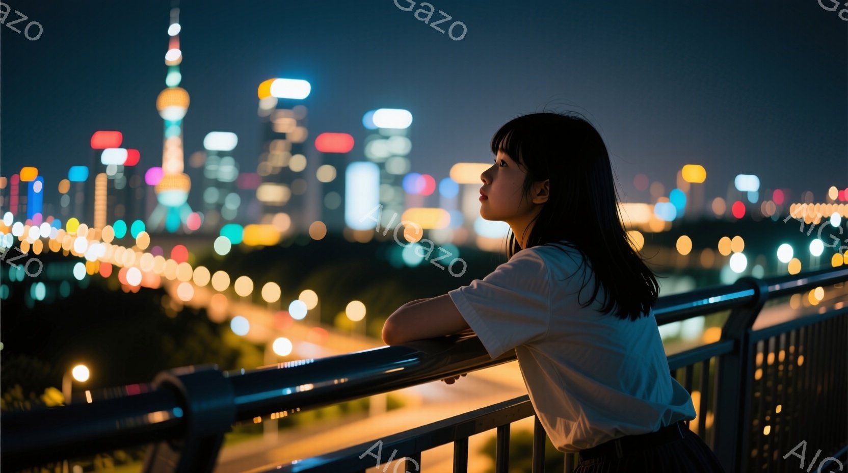 夜景を背景に、黒髪の女性が手すりに寄りかかっている。白いTシャツと黒いズボンを身に着け、横顔はどこか物憂げで、遠くを見つめている。背景には、きらびやかな高層ビル群と、水面に反射する光が広がり、都会の夜の静けさと少しの寂しさを感じさせる。