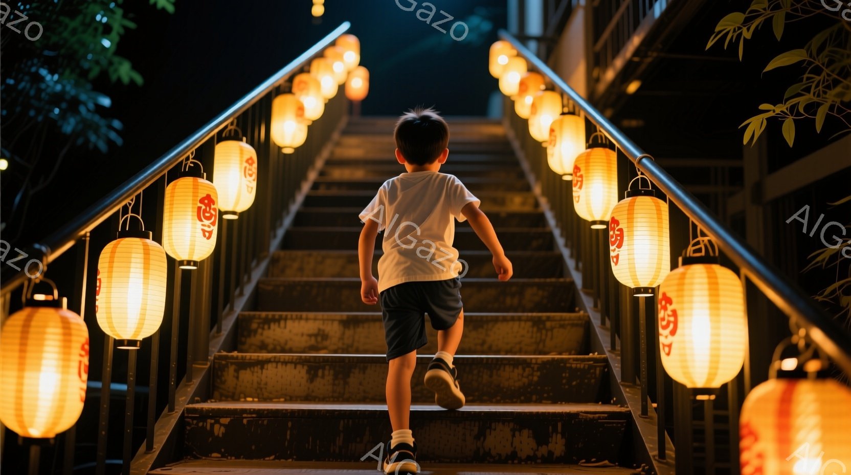 少年は石段を上っている。白いTシャツと短いズボン、そして黒いスニーカーを履いている。周囲には提灯が灯り、薄暗い夜の石段が幻想的な雰囲気を醸し出している。