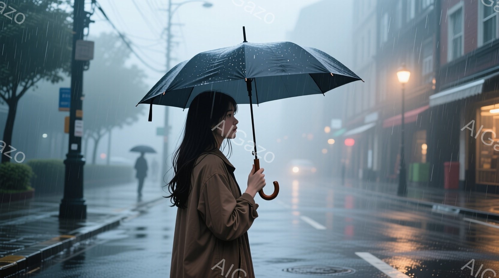 雨が降る街並みで、女性が傘をさして立っている。ベージュのジャケットと黒い服を着ており、髪は肩までの長さで、ややうつむき加減で前を見ている。背景には灰色の建物と車が見え、全体的にしっとりとした、物憂げな雰囲気が漂っている。
