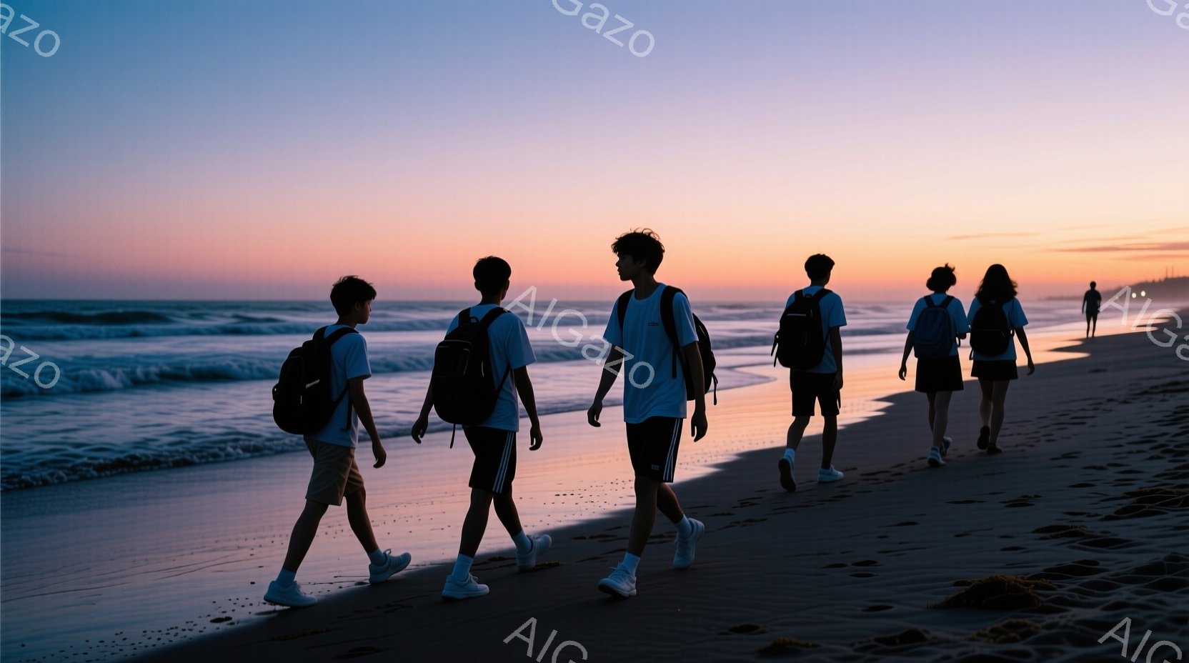 砂浜を数人の人物が海に向かって歩いているシルエットが印象的だ。彼らは皆、バックパックを背負い、Tシャツと短パン姿で、カジュアルな装いをしている。夕焼けの空がオレンジと紫に染まり、穏やかで暖かい雰囲気を醸し出している。