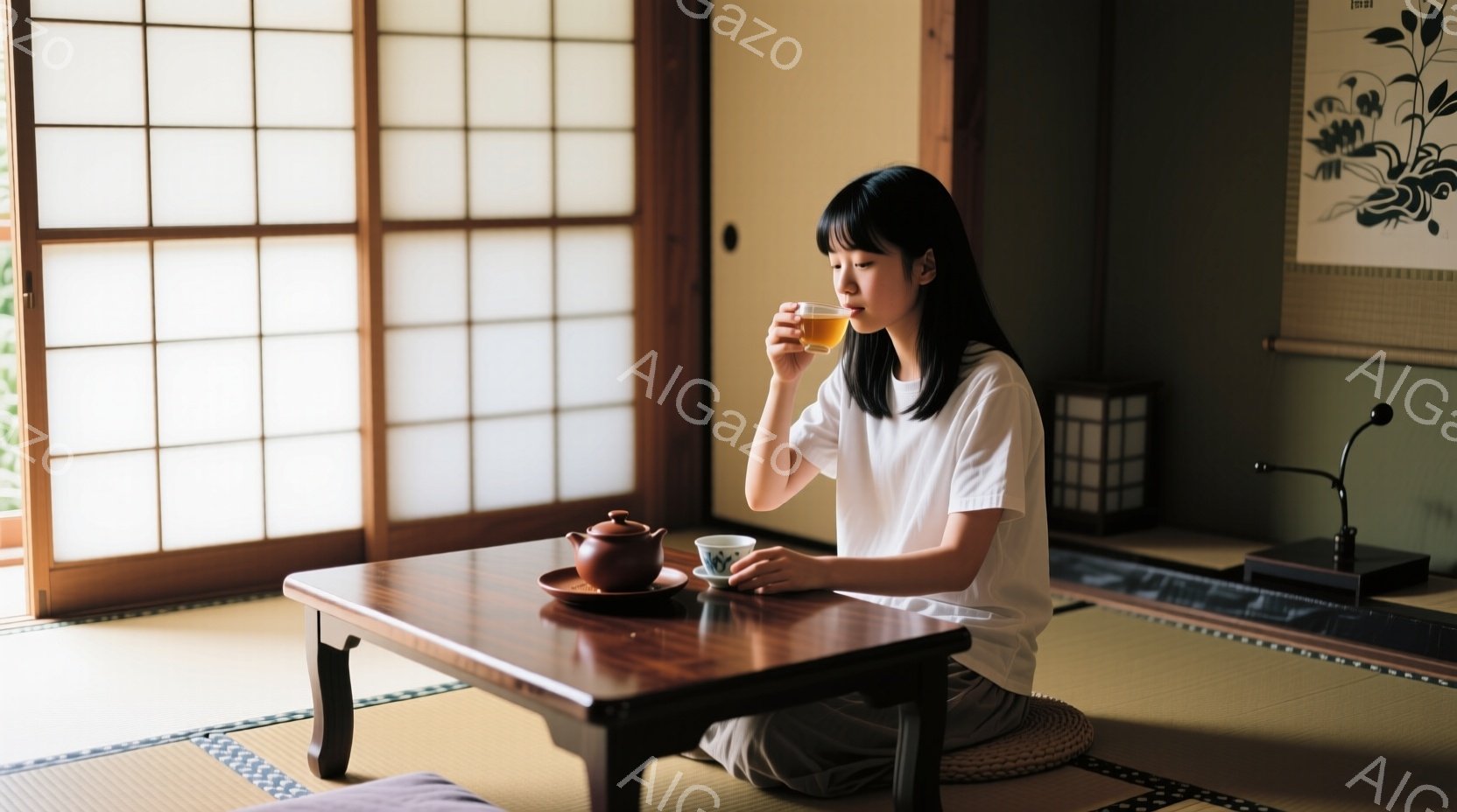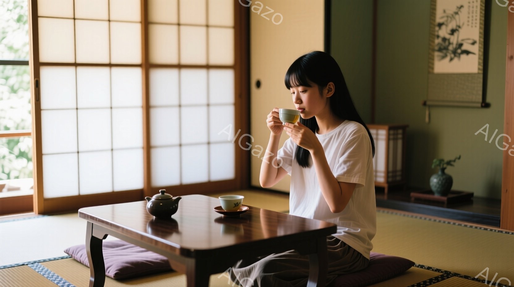 畳の上に座っている若い女性は、白いTシャツとベージュ色のズボンを着用し、短い黒髪をしています。彼女は低い黒いテーブルの前に座り、緑色の湯呑みで何かを飲んでおり、少し微笑んでいるように見えます。背景には、障子窓と掛け軸が見え、部屋全体が穏やかで静かな雰囲気です。
