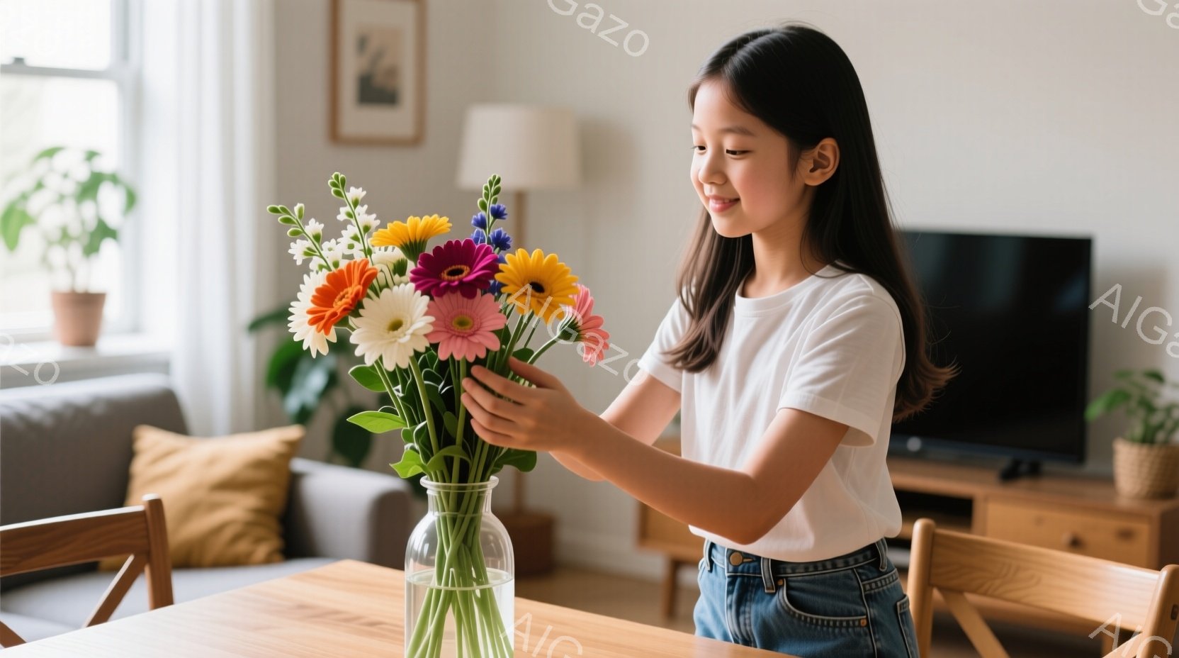 若い女性が花瓶に花を活けている。彼女は白いTシャツとジーンズを着ており、長い髪はゆるくカールしている。背景にはグレーのソファ、木製のテーブル、観葉植物が見え、暖かく穏やかな家庭的な雰囲気が漂っている。