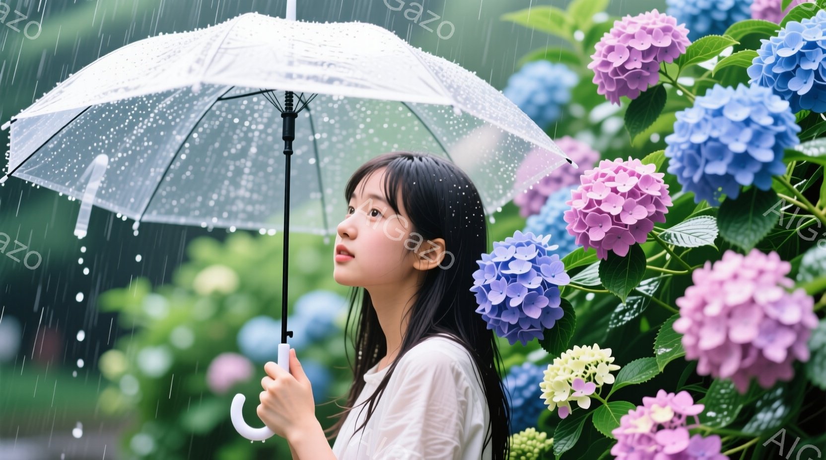 雨の中、若い女性が紫陽花の茂みの前に立っている。彼女は白いTシャツを着ており、長い黒髪はストレートで、顔は少し上を向いている。紫陽花はピンクと青の色調で咲き乱れ、雨が降り注ぐ穏やかで幻想的な雰囲気を醸し出している。