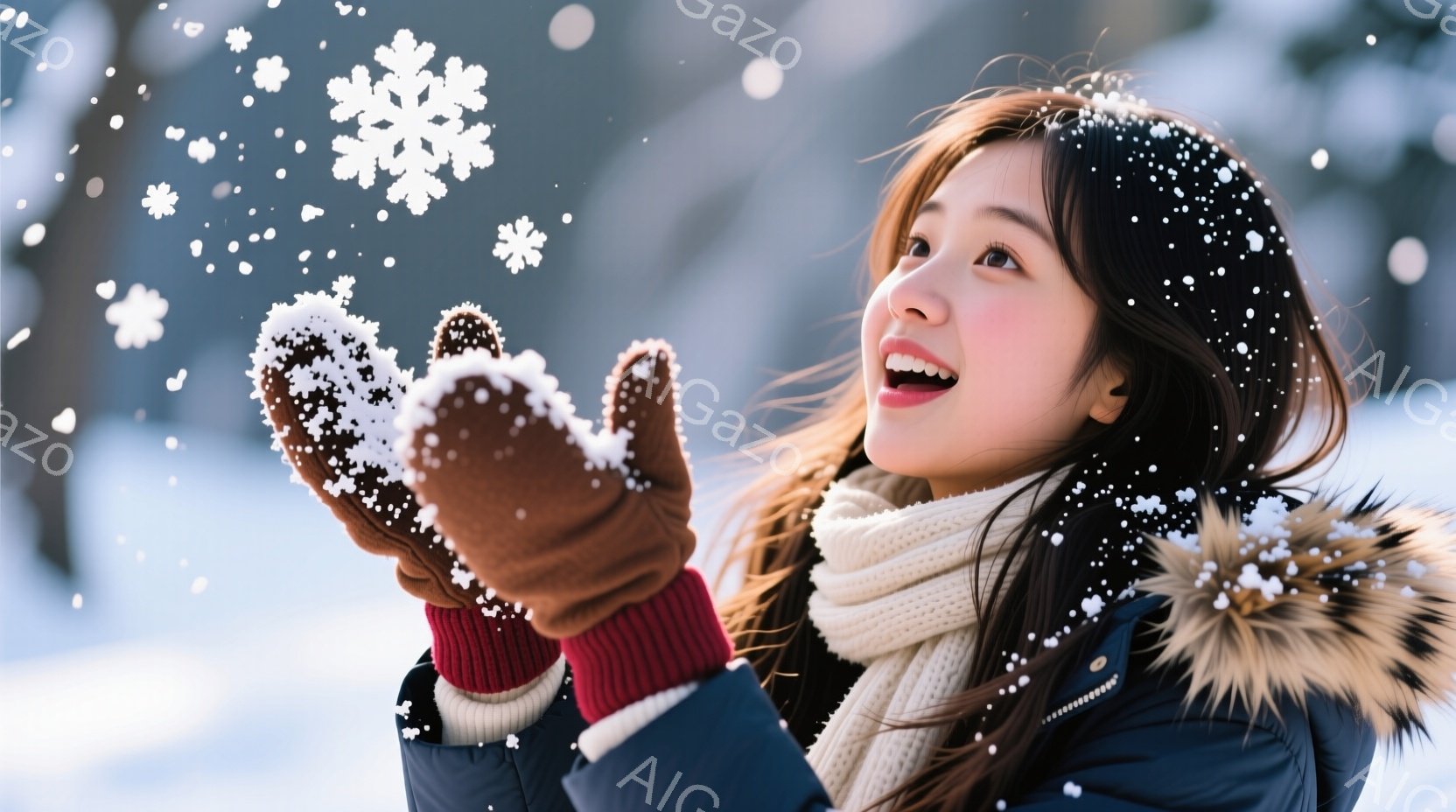 長い黒髪を背中に垂らし、赤いストライプのニット帽とマフラーを身につけた女性が、雪片を手のひらに受け止めている。彼女は黒のダウンジャケットを着ており、表情は明るく微笑み、冬の雪景色を楽しんでいる様子がうかがえる。背景にはぼやけた木々が見え、雪が降り積もる静かで穏やかな雰囲気が漂っている。