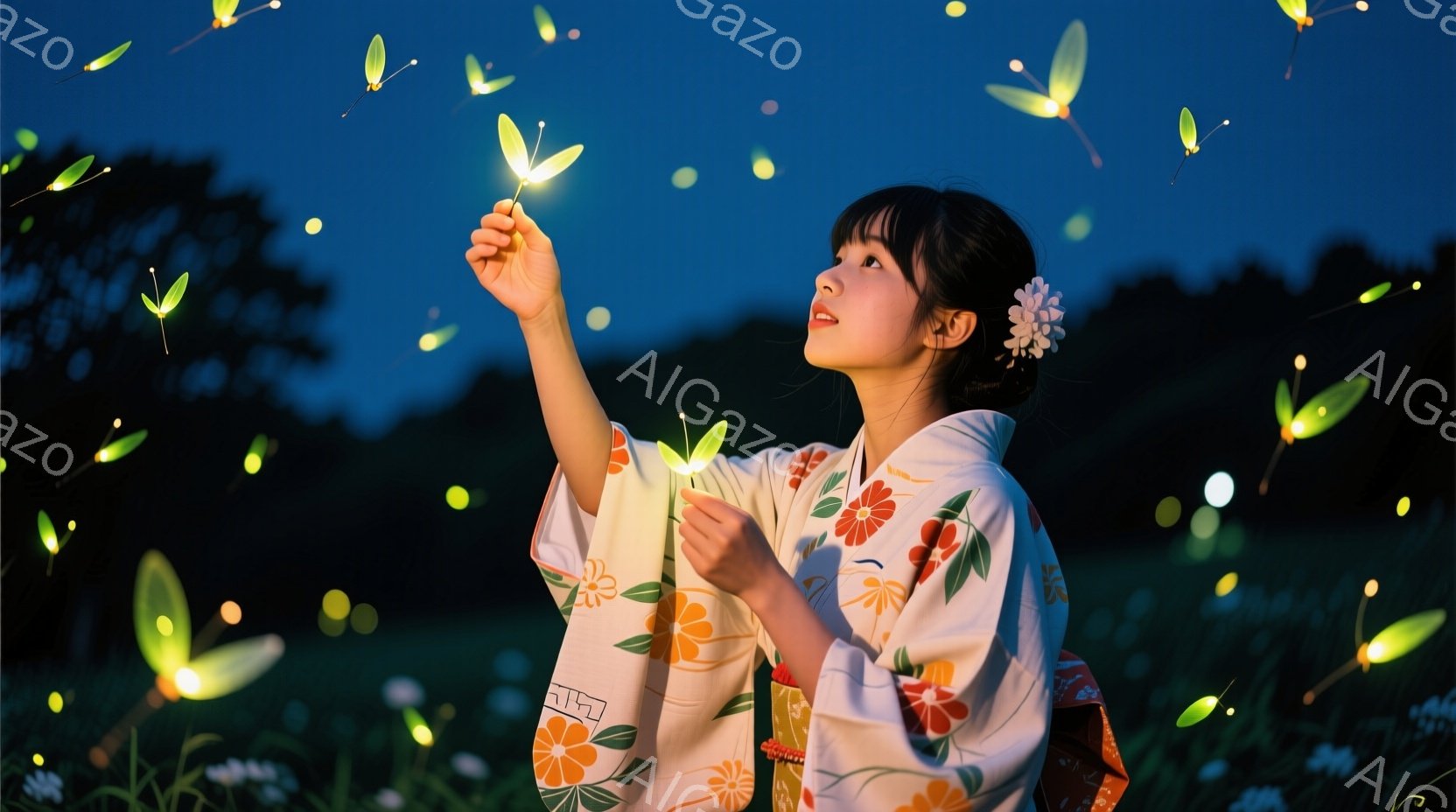 深い青色の夜空を背景に、浴衣を着た若い女性が蛍を手にしています。女性は黒髪を後ろでまとめ、白い花を髪飾りとしてつけており、少し上を見上げて穏やかな表情をしています。周りにはたくさんの蛍が舞い、幻想的な夏の夜の雰囲気を醸し出しています。