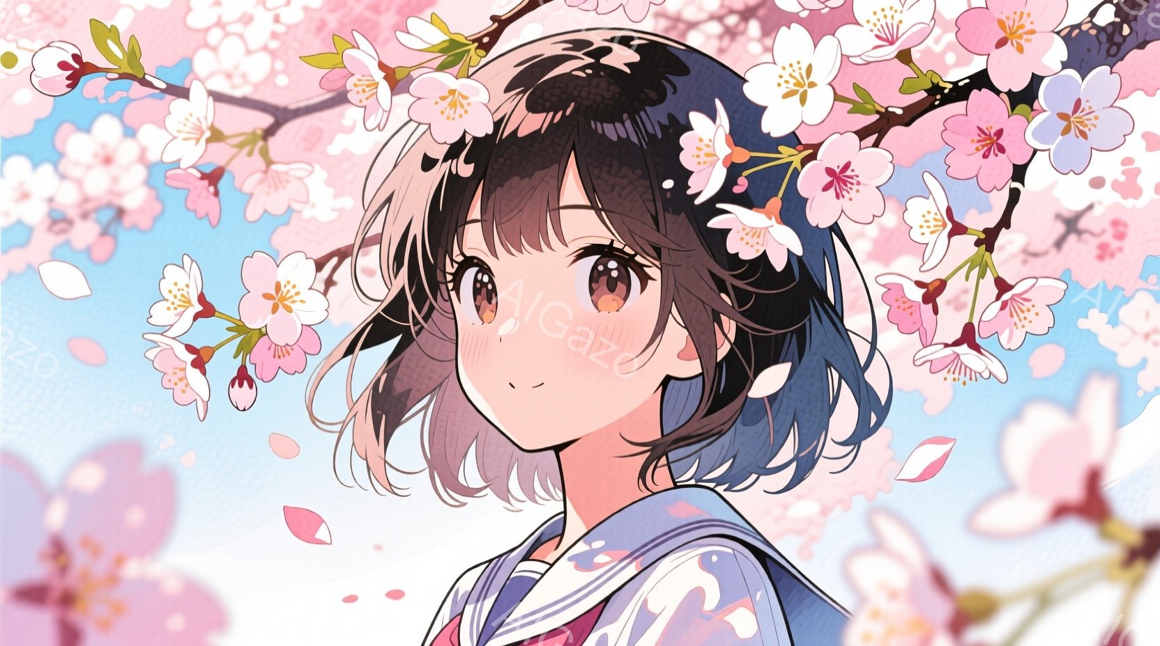 短い黒髪の少女が、セーラー服を着て、少し上目線で微笑んでいます。背景には桜の花びらが舞い散り、春の暖かく穏やかな雰囲気が漂っています。彼女の表情は優しく、希望に満ちており、見る人に安らぎを与えます。