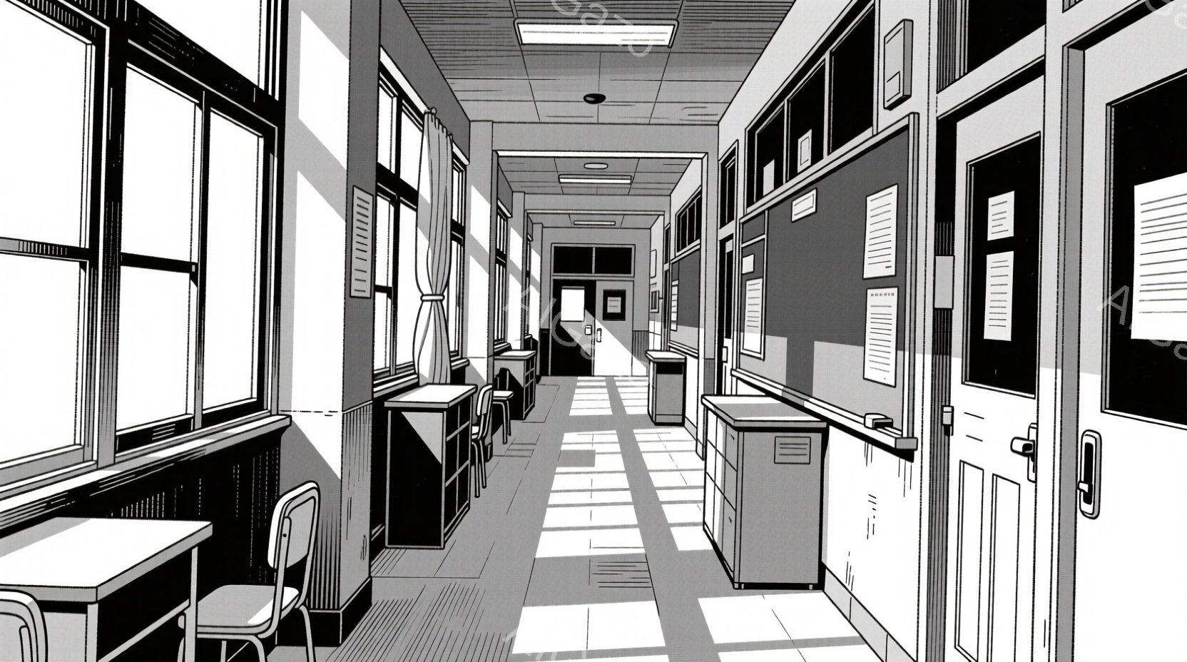 白黒の漫画風の画像は、長い廊下の様子を描いています。左右に等間隔に並んだ窓から光が差し込み、廊下の床に強い影と光のコントラストを生み出しています。廊下の奥には閉じたドアが複数見え、静寂で少し寂しげな雰囲気が漂っています。